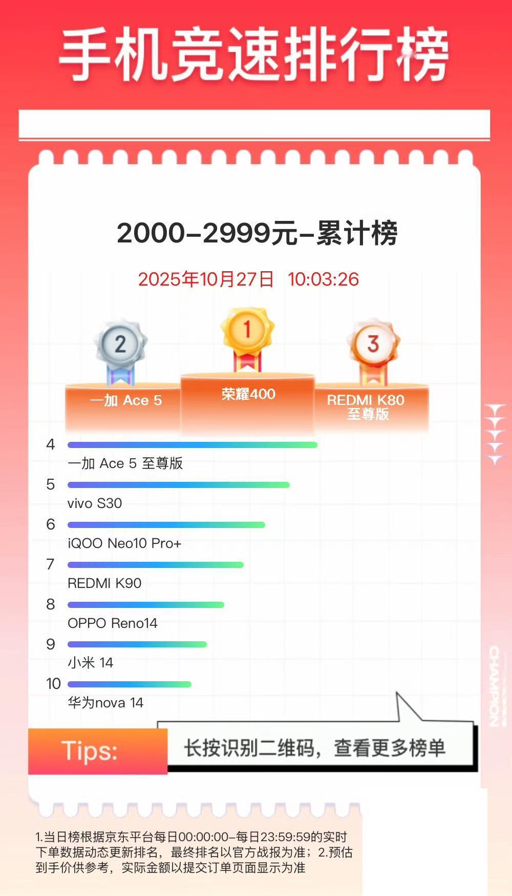 好家伙,我承认我眼红了,荣耀400这波降价,来的太及时了。 直接1800多就能到手,价格直接跌破我心理预期了,这白菜价来得也太猝不及防!明眼人都能看出来,这价格过了就不会再有了。而荣耀400目前也是2000-2999元价位段累计销量TOP1,这是真有实力啊。
