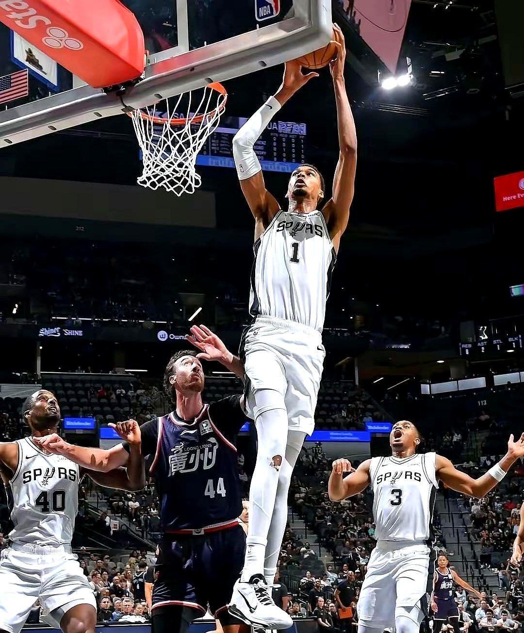 他一站到底线,对手直接弃投。 不是不敢投,是投了也进不了——盖帽像雨点,还带回防三分线。 2米24的身高,长臂一伸,半个球场都是他的地盘。 快攻回追,库里刚抬手,球已经飞出界外。 没人骂他犯规,大家都说:这娃是防守外挂。 马刺没让他打满,怕他累着。 可对手怕的不是他累,是怕他不累。 三分能投,盖帽能炸,跑得比后卫还快。 这不是中锋,是会走路的防守系统。 别问能不能拿MVP,先问:联盟要不要给他单独设个“文班规则”? ——谁敢在他面前出手,谁就等于主动认输。 他还没发力,联盟已经慌了。