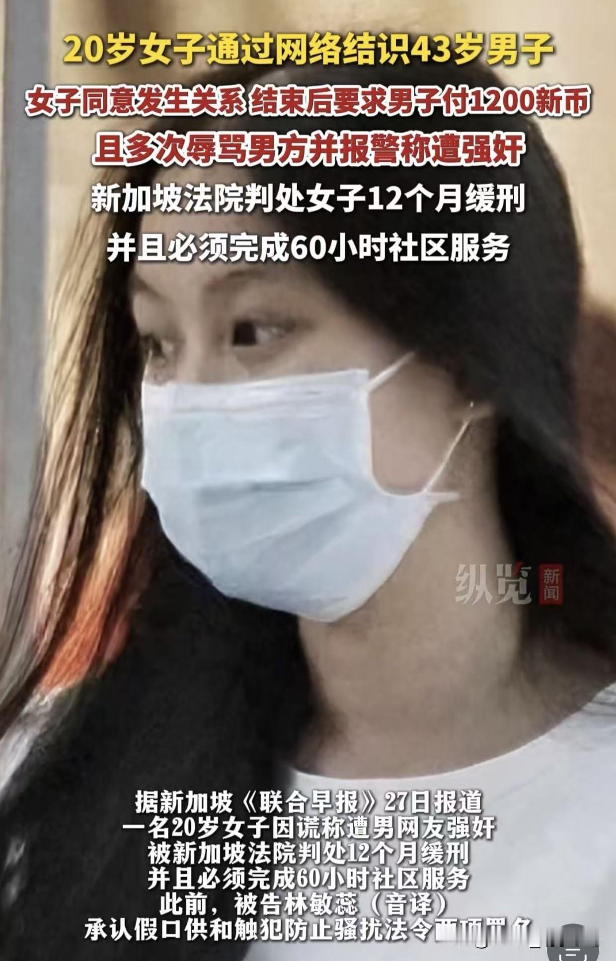 真的是无奇不有, 据新加坡《联合早报》27日报道,一名20岁女子约完炮嫌钱少, 转身就报警说自己被强奸了,这脑回路真是绝了! 监控拍得一清二楚,你情我愿的事,硬生生被他演成“受害者”大戏。 结果呢?法院直接判他诬告,缓刑+做义工+晚上十点后不准出门, 爸妈砸了五千新币才把他捞出来,丢人又烧钱! 每年新加坡都有十几起这种假报案,三成以上是为了钱! 说一套做又是一套,法律又不是讹人工具! 真受害者还没说话,这些人先拿“强奸”当大棒挥,寒了多少人的心? 别以为哭诉就有理,新加坡只认证据! 这世道,我们要挺真正受害的人,让更多人看清正义。