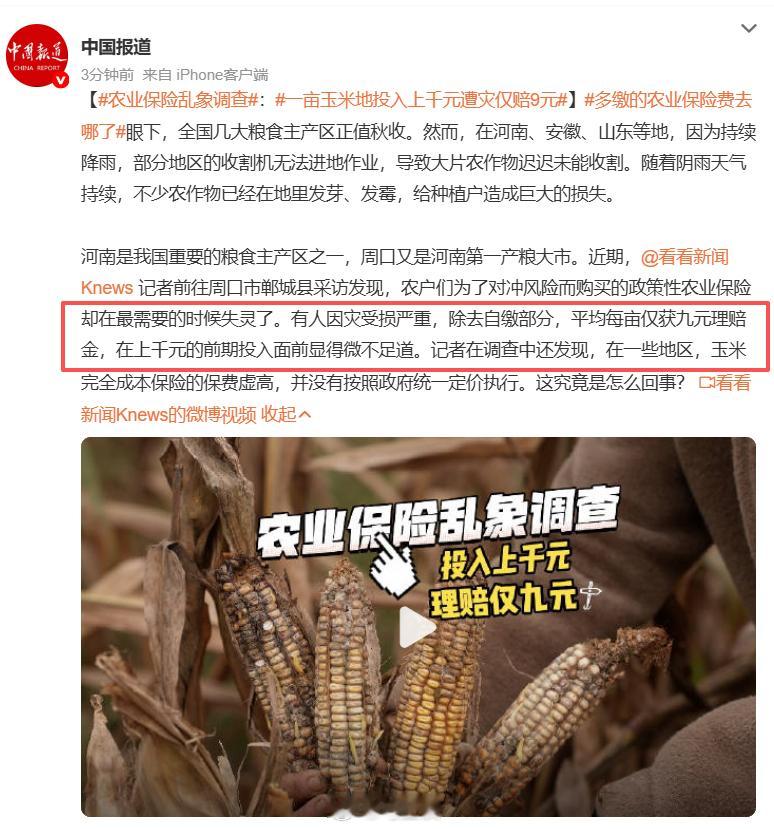 一亩玉米地投入上千元,遭灾后除去保险自缴部分,仅赔9元?这太过分了!此前,河南、安徽、山东等几大粮食主产区秋收时遭遇持续降雨,不少玉米在地里发芽、发霉,给种植户造成巨大的损失。投保了赔偿却不到位,你让农民怎么生活?投你这个保又有何用?