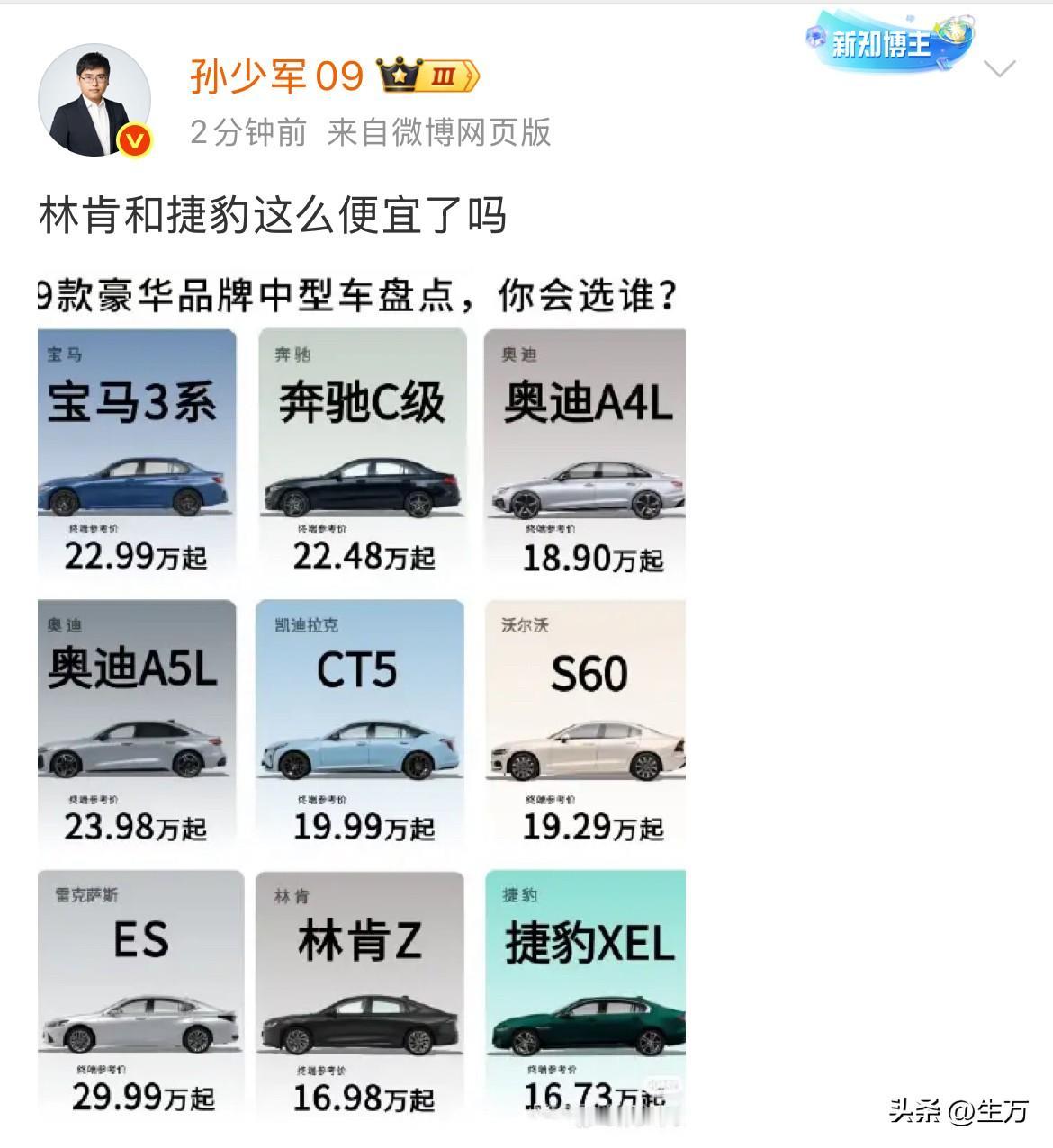 孙少军: 现在林肯和捷豹这么便宜了吗? 就是刚才,孙少军收集了最新的销售数据,做了张,算式非常平价的进口合资车的价格图: 从他的这张图里面来看,目前宝马3系入门价格只需要22.99万,奔驰C级的入门价格只需要22.48万! 即便是主流的奥迪A4 L,现在已经进入了10多万的空间起步价格只需要18.9万,而奥迪A5L起步价格是23.98万! 曾经的网红车,凯迪拉克CT5,现在也落到了10多万的空间,来到了19.99万,一向以安全著称的沃尔沃S60现在的入门价格也给你弄到了19.29万。 以前价格很坚挺的雷克萨斯ES系列,现在居然落到了20多万的空间,来到了29.99万,当然价格变化相对来说比较大的就是林肯和捷豹。 只是不知道懂车帝上面这个报价,和大家实际跑到线下4S店去看的价格差别有多大,如果不是很大的话,其实现在下手真的是一个很好的机会,因为马上到年尾了,他们为了完成目标任务,在价格方面应该会有一股持续的松动时间,估计在这个时候已经开始行动了。