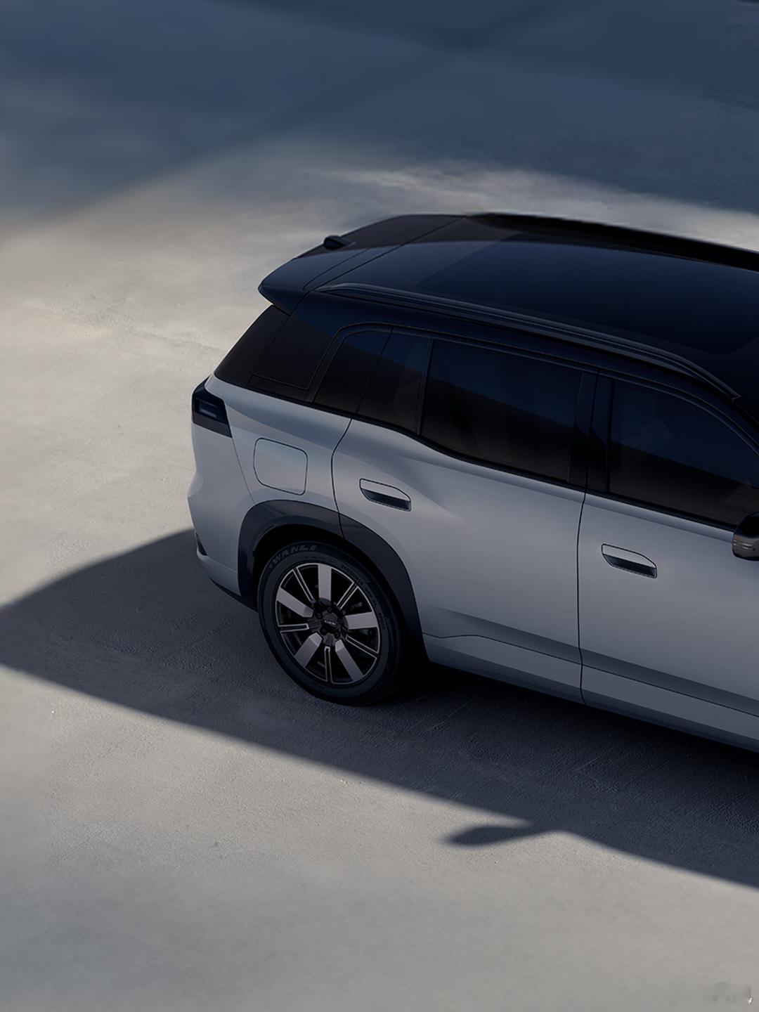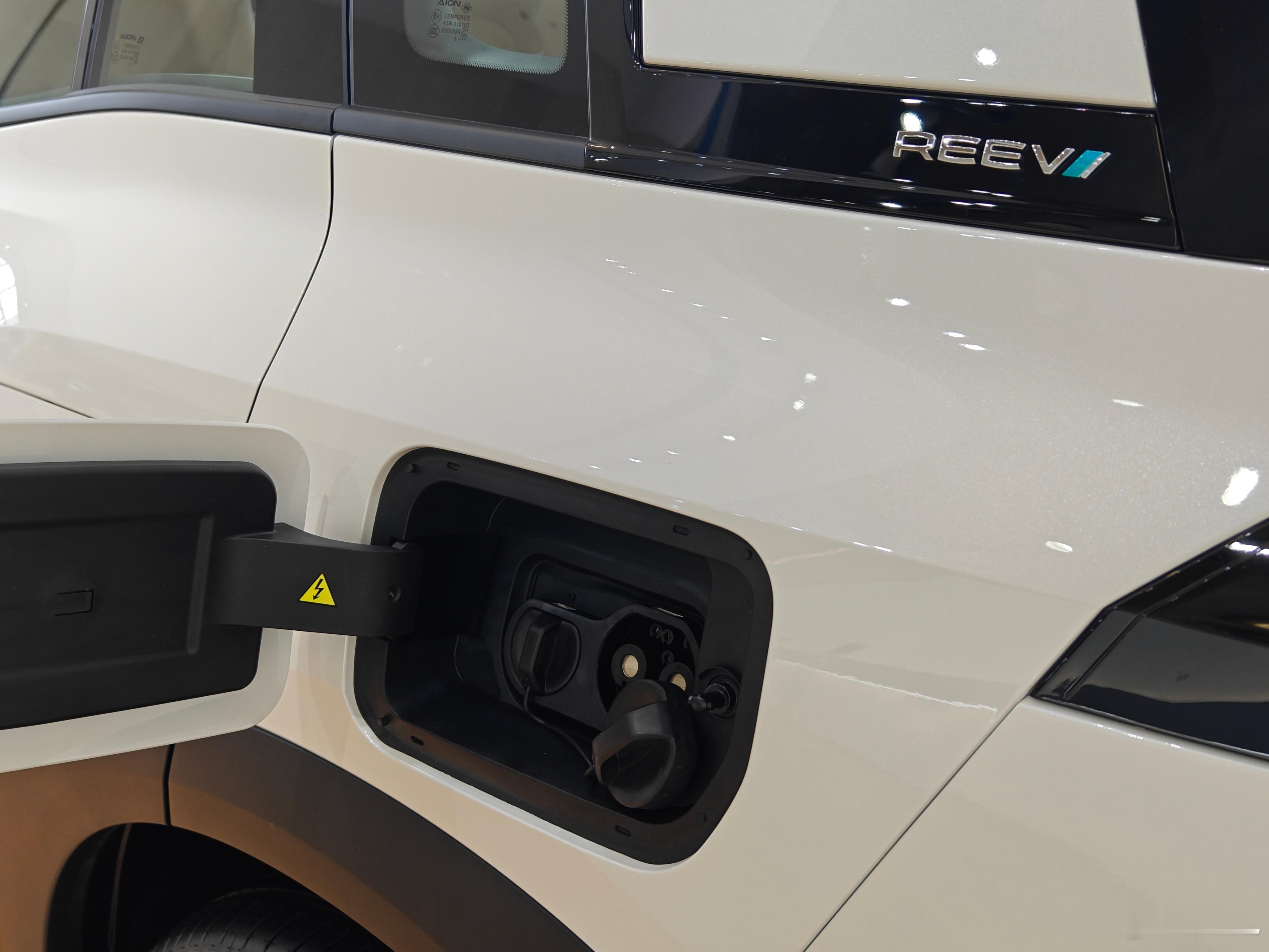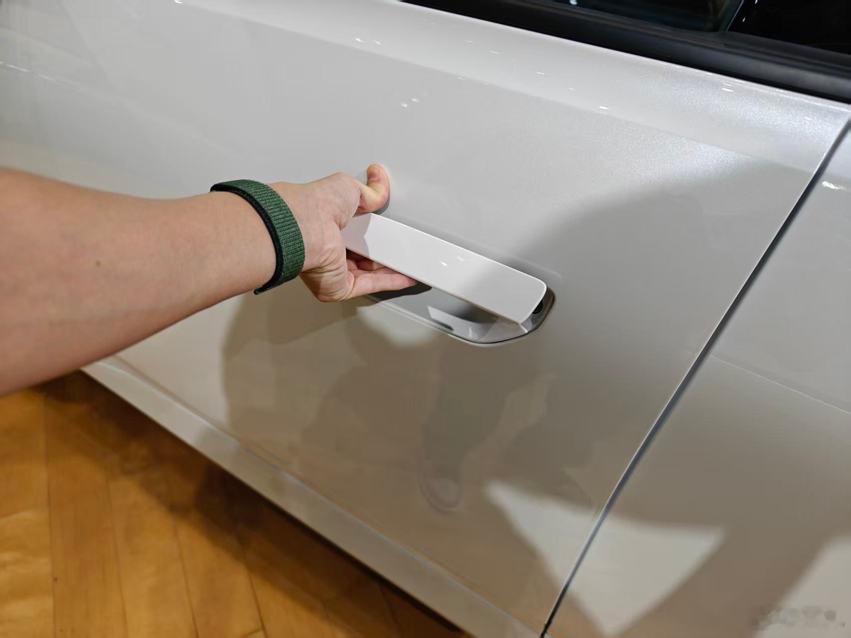 3、再留意外观两个细节,一是门把手,样子是半隐藏,实际上是机械的;另外增程版的充电口在后面,跟纯电版不一样;