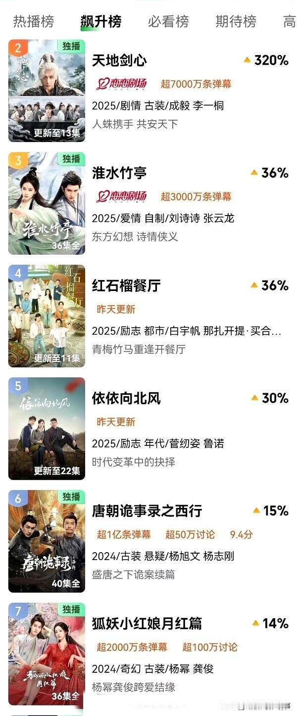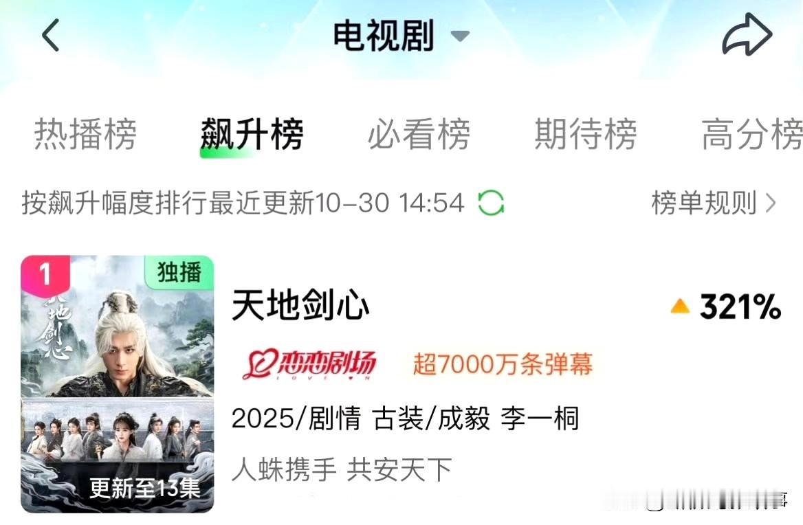 《天地剑心》热度炸场:成毅带飞剧集,连“狐妖”都被捎上飙升榜 成毅主演的《天地剑心》彻底点燃爱奇艺热度:不仅站内热度破9000,飙升榜涨幅更是飙至321%,弹幕量超7000万。 更意外的是,这波热度还“带飞”了《狐妖小红娘月红篇》等剧,将其一同拽入飙升榜。从主角白发造型到剧情节奏,《天地剑心》的爆款势能,连同平台剧集都跟着沾了光。