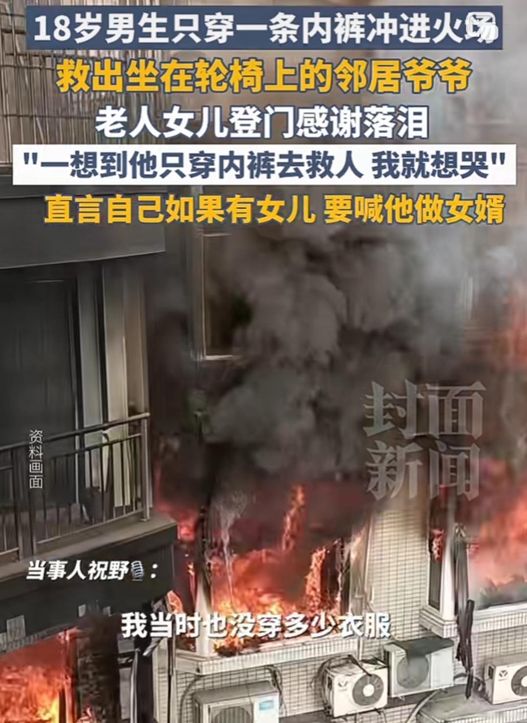 重庆一老小区发生大火,18岁小伙穿内裤,衣服裤子都没来得及穿,把邻居的父母两位老年人救出火场。邻居阿姨登门落泪感谢,直言要是有女儿,就嫁给你,让你当我女婿。真的是少年当自强,值得夸赞啊[赞][赞][赞]