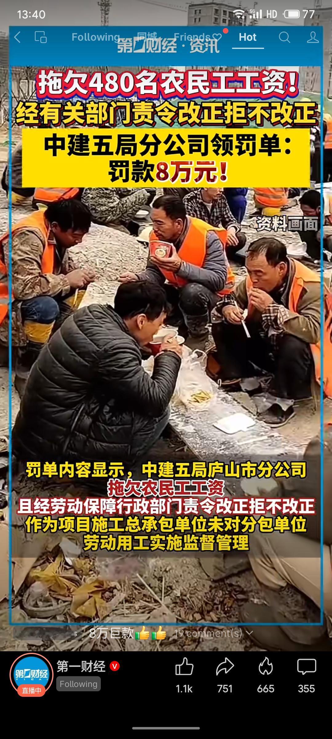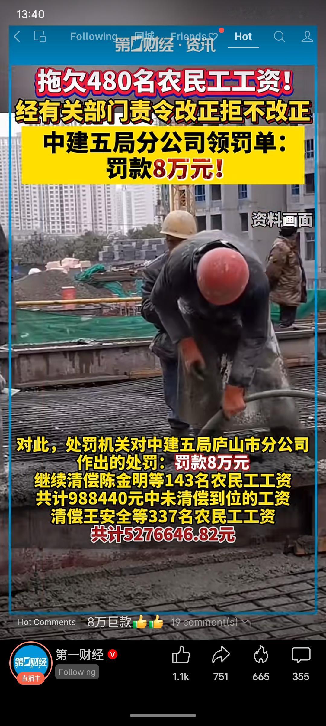 中建五局庐山市分公司因拖欠480名农民工约626万元工资,且在人社部门责令改正后拒不改正,被处以8万元罚款。处罚事由还包括其作为总承包单位未履行对分包单位的劳动用工监管责任。此事引发网友对罚款金额过低的质疑。