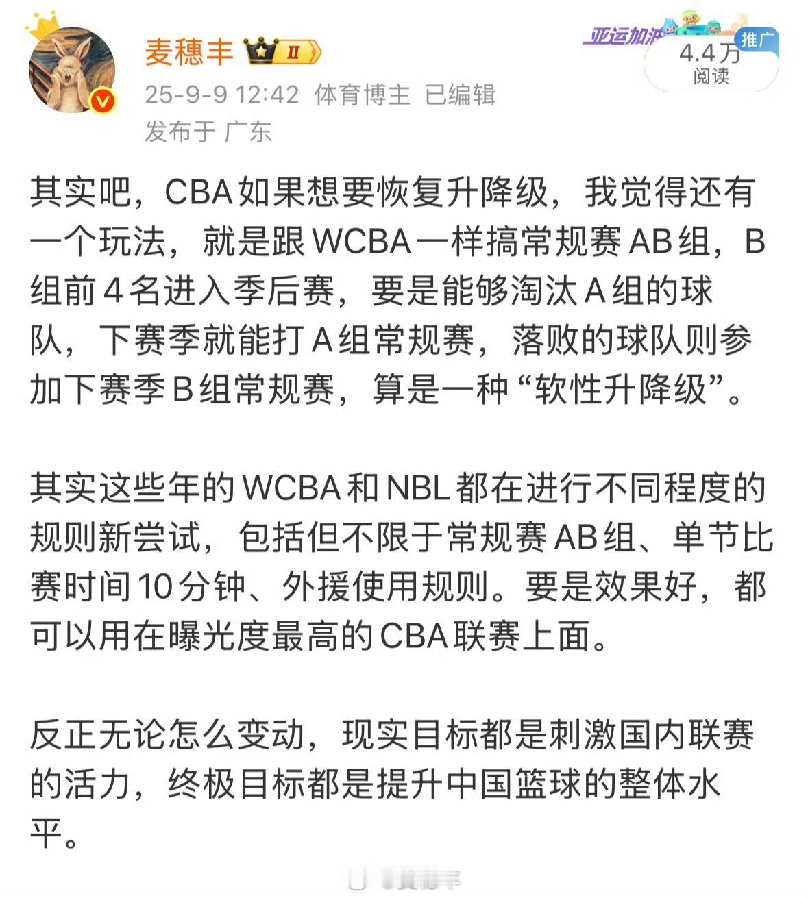 几个月前就说了,其实这些年的WCBA和NBL都在进行不同程度的规则新尝试,包括但不限于常规赛AB组、单节比赛时间10分钟、外援使用规则,要是效果好,都可以用在曝光度最高的CBA联赛上面。