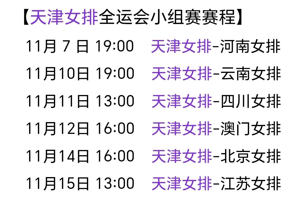 全运会|天津女排小组赛程 11月7日19:00 天津-河南(朱婷) 11月10日19:00 天津-云南 11月11日13:00 天津-四川 11月12日16:00 天津-澳门 11月14日16:00 天津-北京(王云蕗) 11月15日13:00 天津-江苏(张常宁,龚翔宇) 天津女排全运会十二人名单 主攻:李盈莹、王艺竹、刘美君 副攻:王媛媛、张世琦、夏思佳 接应:陈博雅、杨艺 二传:姚迪、孟豆 自由人:刘立雯、孟子旋 作为上届冠军🏆,天津女排本次坐镇A组,目标直指卫冕。核心主攻李盈莹经过调整,状态正渐入佳境;然而遗憾的是副攻袁心玥因伤确认缺席,愿她早日康复。尽管拥有李盈莹、王媛媛、姚迪等多位国手,天津队在小组赛仍将面临严峻挑战:朱婷领衔的河南队虎视眈眈,王云蕗带领的北京队韧劲十足,更有张常宁与龚翔宇坐镇的江苏队强势围剿。冠军之路从无坦途,期待津门女排在激战中打出风采!