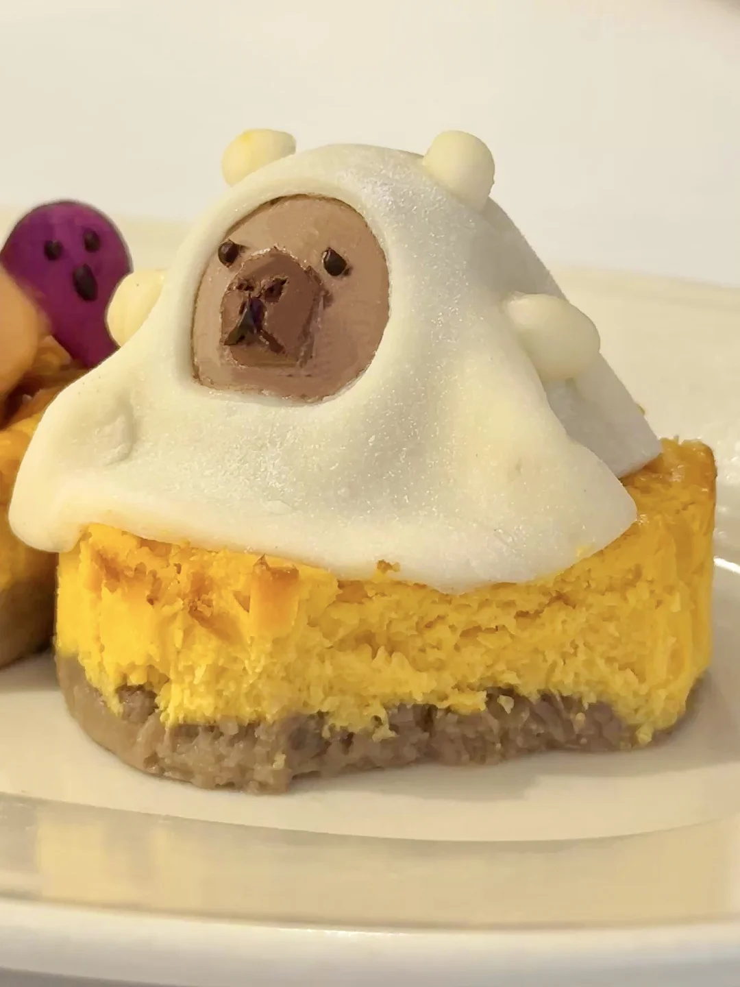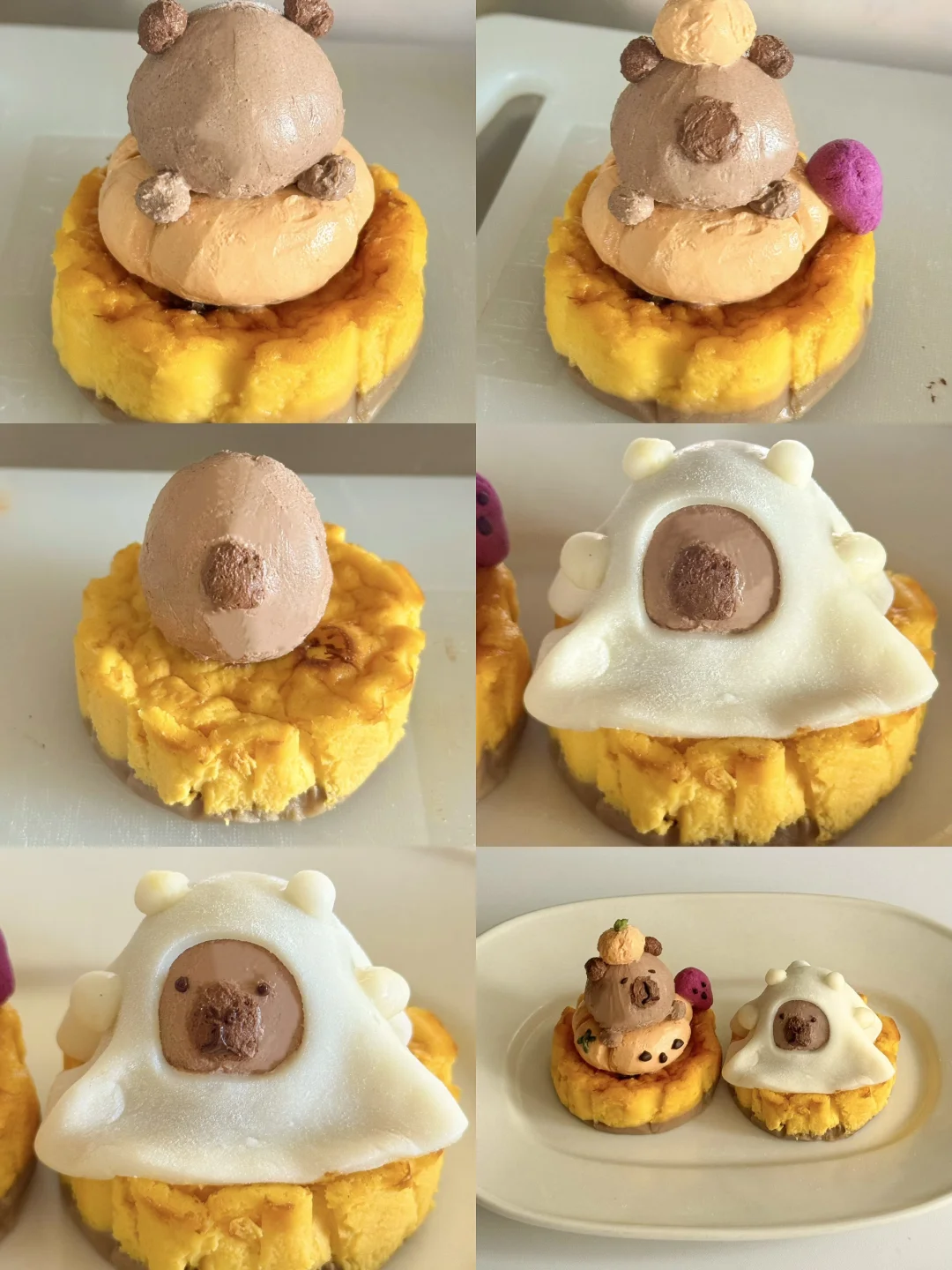 2️⃣拆开两个南瓜栗子巴斯克蛋糕,将希腊酸奶捏出卡皮巴拉,另一只上面盖上麻薯皮,最后用巧克力酱画上表情就好啦