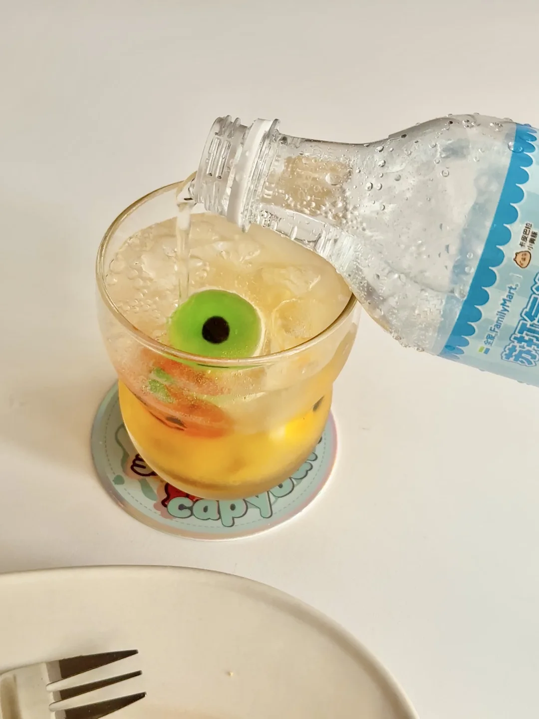 饮品材料:全家气泡水、黄桃汁、橡皮糖