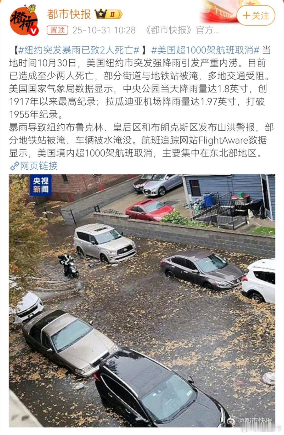 纽约突发暴雨已致2人死亡,难道我又被那些大V骗了?不是说好的“在美国哪怕遇到最大规模的暴雨,自己打着伞走在外面,脚面绝对不会进水——地面不会有任何一个坑积水”吗?不是说好了,超级城市有“防汛智慧”吗?这也太能骗了吧![哈欠] 美国超1000架航班取消