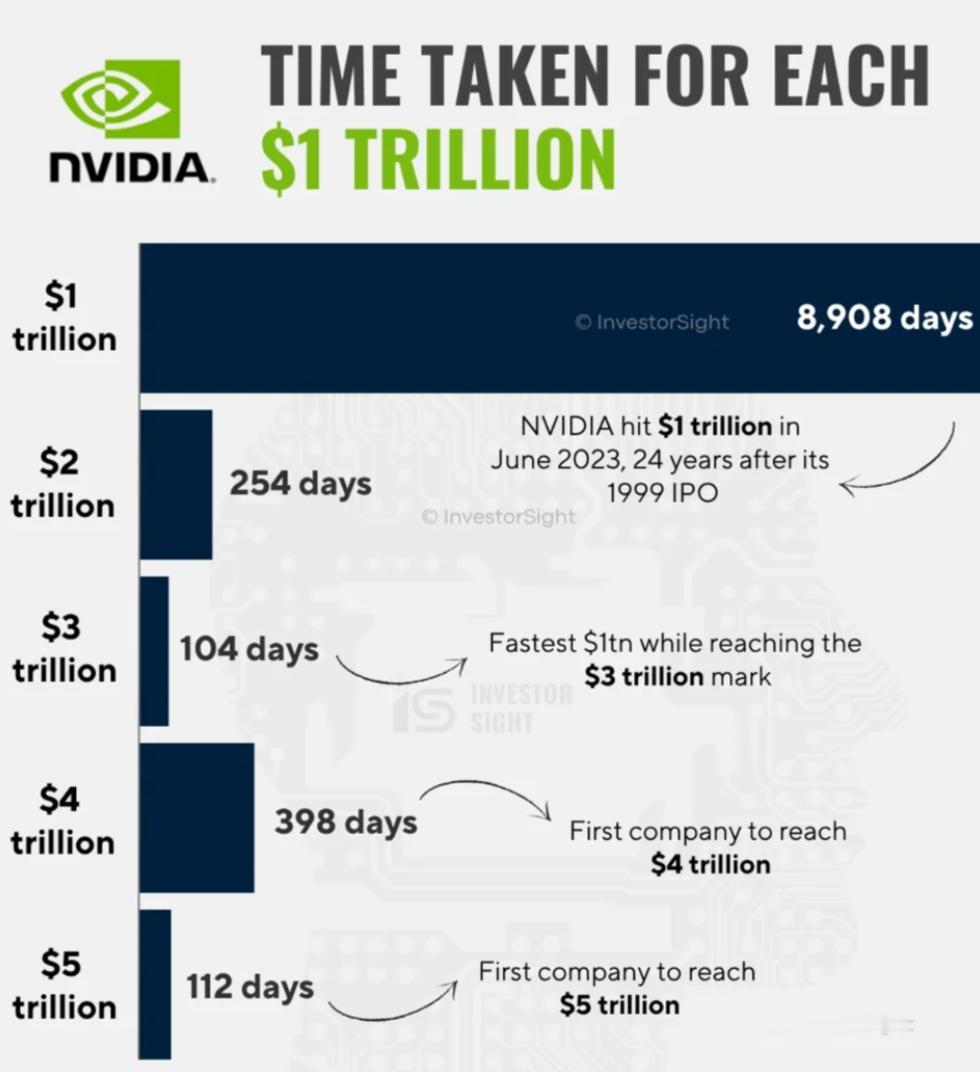 到了 2025 年 7 月,英伟达再度刷新纪录,市值突破 4 万亿,彻底甩开其它巨头,稳居世界之巅。可故事还没结束,距离 4 万亿不过三个月,它又冲上了 5 万亿。