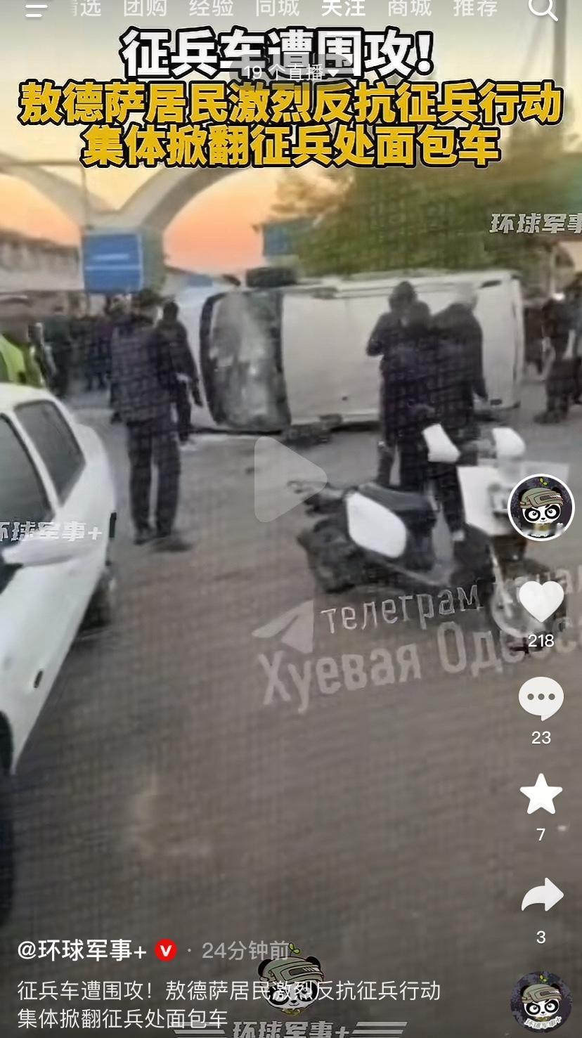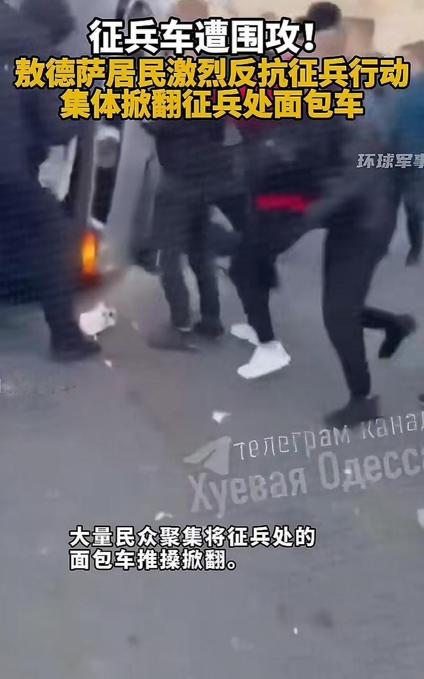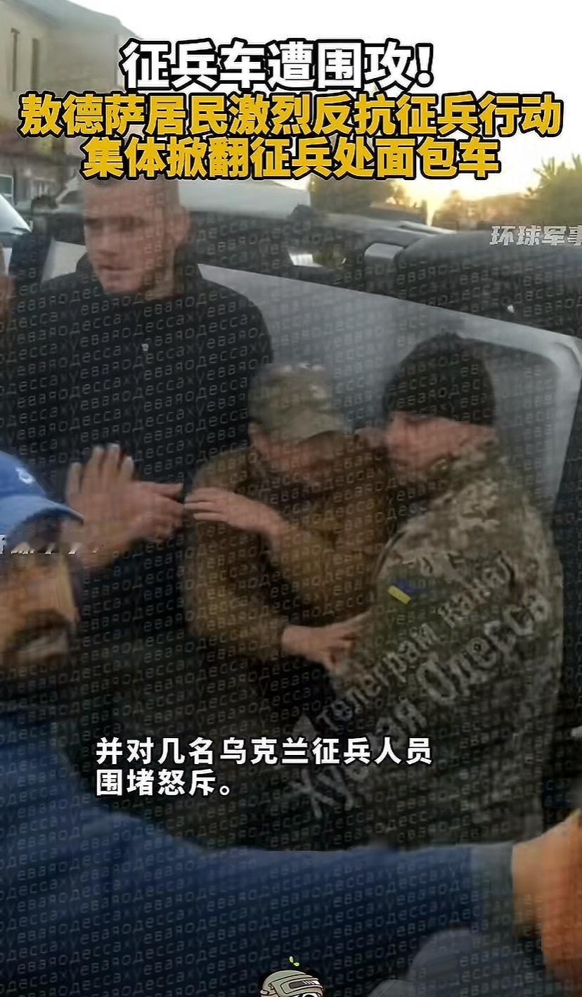 乌克兰敖德萨几个征兵人员遇上大麻烦,大量民众上来围堵他们,边喊边推他们,最后一些人不忍了,直接将面包车推翻,还有些男子不解气,用脚使劲往烂踩前玻璃。