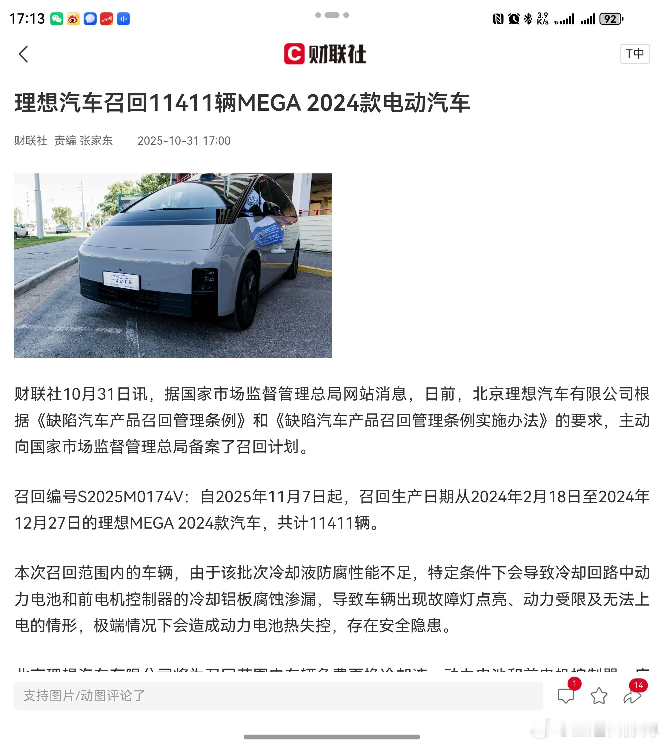 理想汽车决定召回11411辆MEGA 2024款电动汽车。