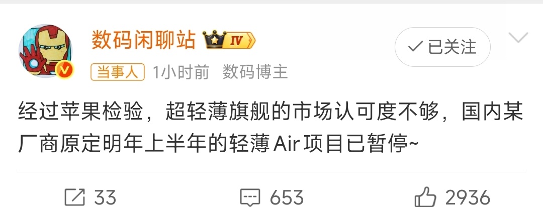 曝国内厂商暂停轻薄Air手机项目苹果Air打了一个样,结果不理想[笑而不语]