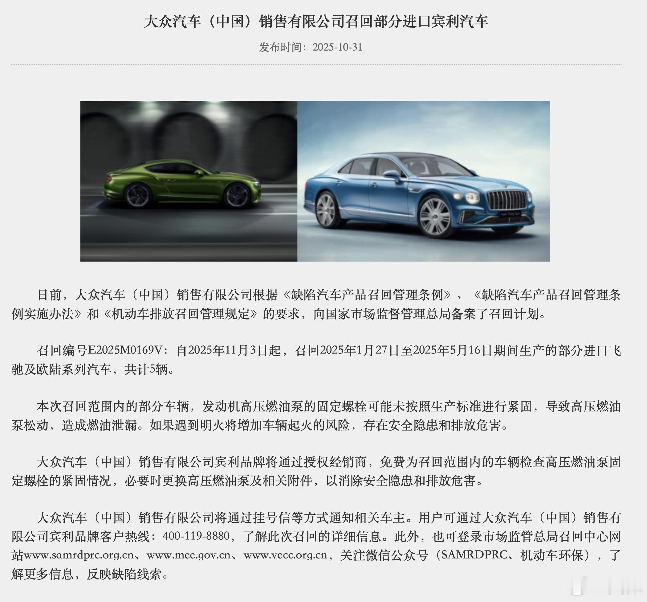 宾利飞驰及欧陆系列5台。起因,发动机高压燃油泵的固定螺栓可能未按照生产标准进行紧固,导致高压燃油泵松动,造成燃油泄漏。如果遇到明火将增加车辆起火的风险,存在安全隐患和排放危害。