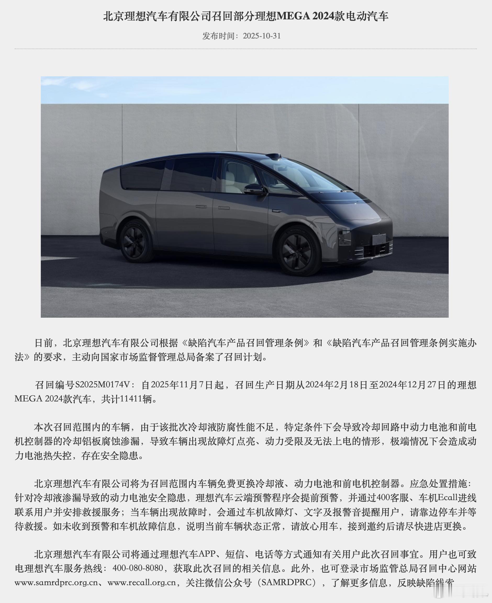 理想MEGA 11411台。起因,该批次冷却液防腐性能不足,特定条件下会导致冷却回路中动力电池和前电机控制器的冷却铝板腐蚀渗漏,导致车辆出现故障灯点亮、动力受限及无法上电的情形,极端情况下会造成动力电池热失控,存在安全隐患。