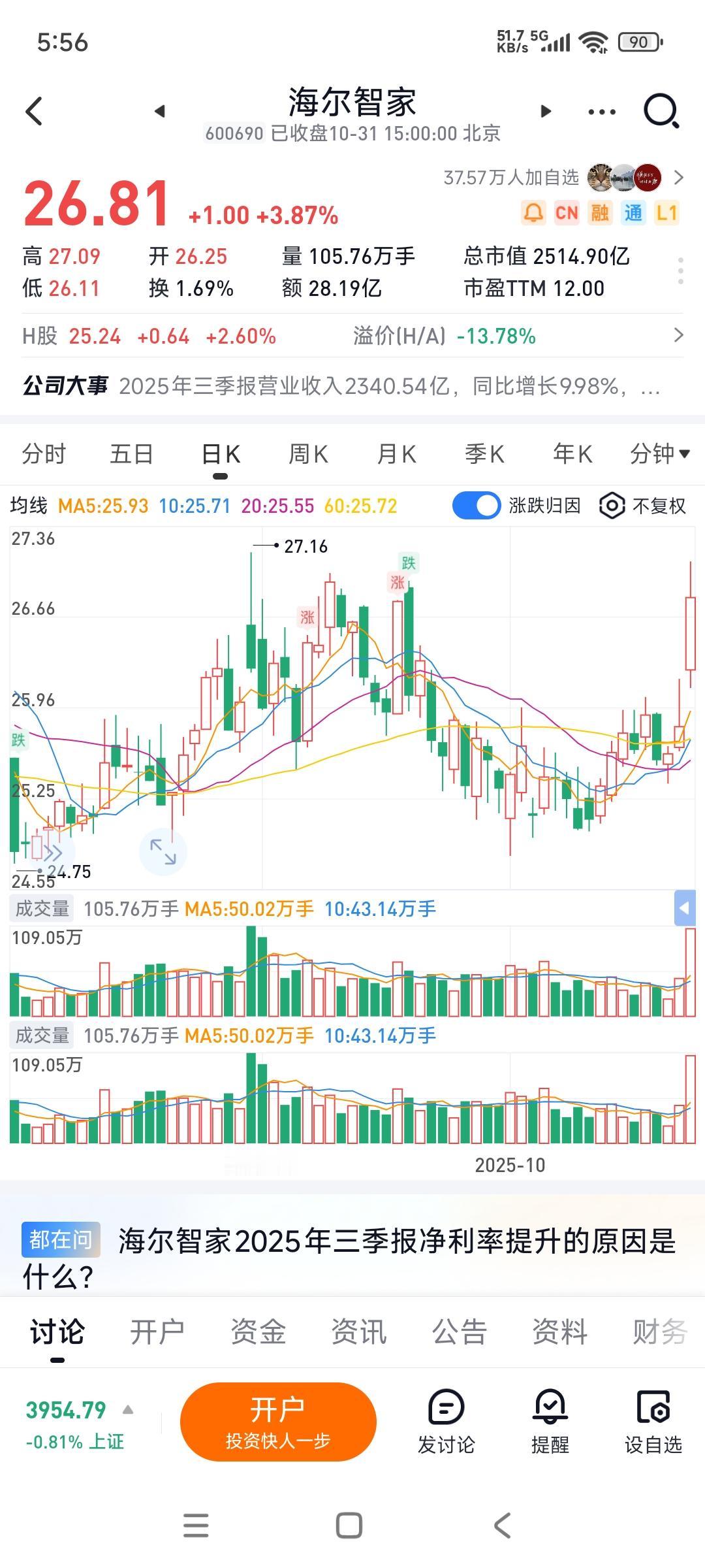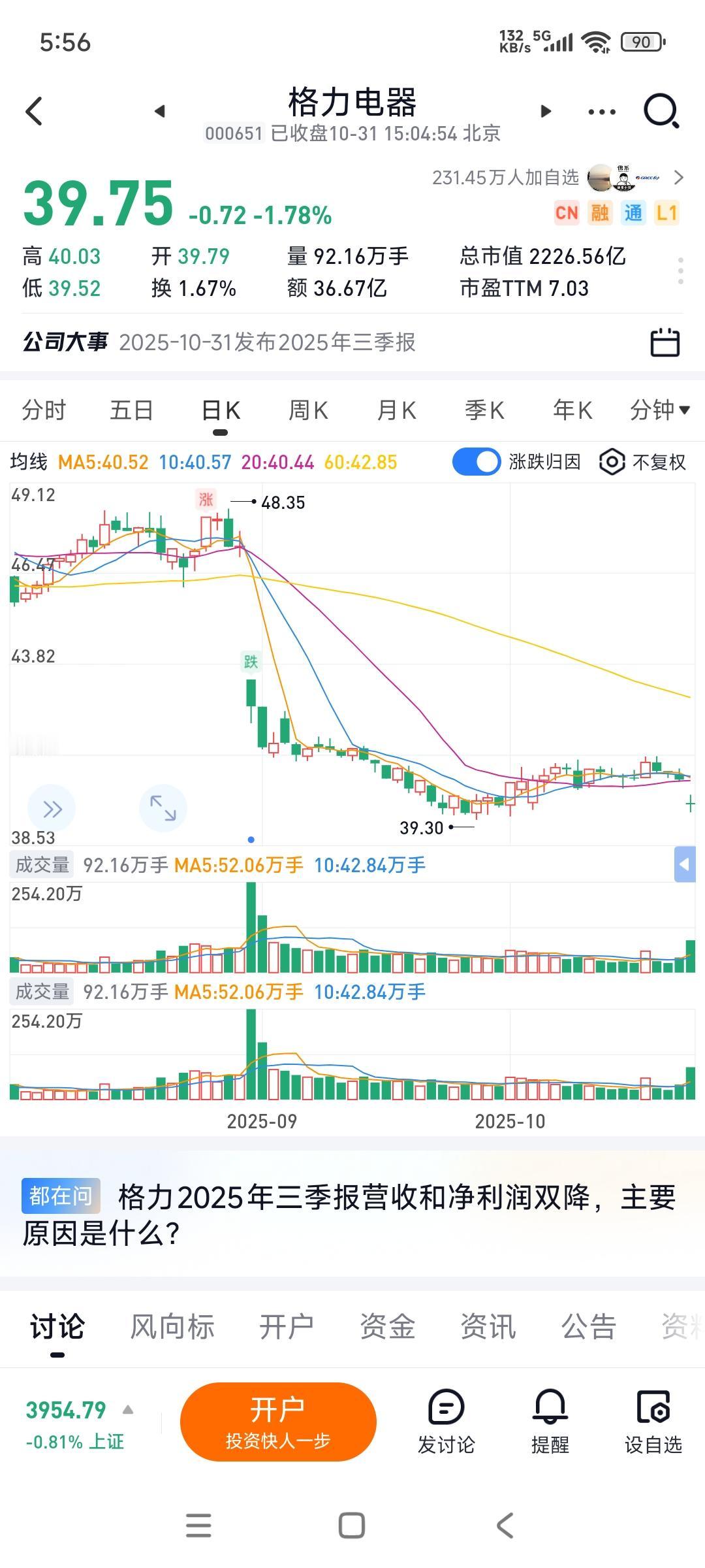 格力电器股价再次跌破40块,而同行海尔智家与美的集团连续两天逆市大涨,尤其是我年中买入的海尔智家,大涨近4个点,一个字——爽![捂脸] 对于格力电器的一些股东,股价不如意就拿分红来自我安慰...[捂脸] 对于大部分人来说,炒股如果不是为了股价上涨,那还还来炒什么股啊? 一家公司如果失去了扩张能力(营收增长),市场被竞争对手抢占,市场份额越来越小的话,它未来的盈利能力也会相应下降,到时候不要说股价下跌,股息率也会下跌... 每年的那点儿分红,估计都补不了股价下跌带来的亏损... 格力电器不是只今年业绩萎缩,是好几年营收没增长了...