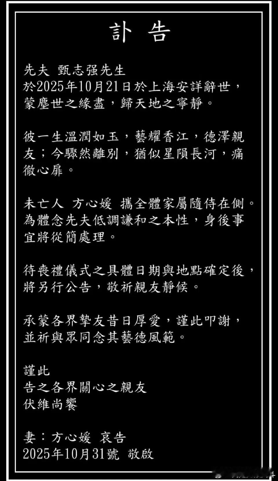 “最帅展昭”去世了,还以为是何家劲,结果是一个从没听过的名字,甄志强。 好奇点进去一看,哦,原来是他啊,虽然之前听名字不知道他是谁,但是这脸太熟了,演过好几部经典港剧,《碧血青天杨家将》、《剑啸江湖》、《雪花神剑》、《与狼共枕》、《法证先锋2》、《岳飞传》、《洪熙官》等等。 他才59岁,还没到退休年龄,10月21号就走了,比欢喜哥还早,真是遗憾。 很多香港演员就是这样,虽然你不一定知道他的名字,但你实实在在看过他的戏,他实实在在陪伴过你的成长。 这些演员就像是我们最熟悉的陌生人朋友,他们一个个开始离世,代表着看过他们戏的我们年龄也渐渐大了,成长了,他们的离去,也代表着我们的童年和青春已经远去,怀念他们的感情是真挚的,因为怀念他们的同时,也是在怀念自己的童年和青春。 又查了一下他的经历,挺励志的,他是模特出身,也曾是职业跆拳道运动员,曾代表中国香港去韩国打跆拳道比赛,后来入行当了演员,43岁因为看好内地发展淡出娱乐圈前往内地创业,先后在深圳和上海开了餐厅,再有消息就是在上海因病去世了。 他去世前一天还发了在机场精神抖擞吃美食的视频,没想到第二天就去世了,太意外了。 他曾在5月份说过,“危险在出现时,往往没有预警”。 生命真是无常啊,一路走好,谢谢你陪伴过我们的成长!