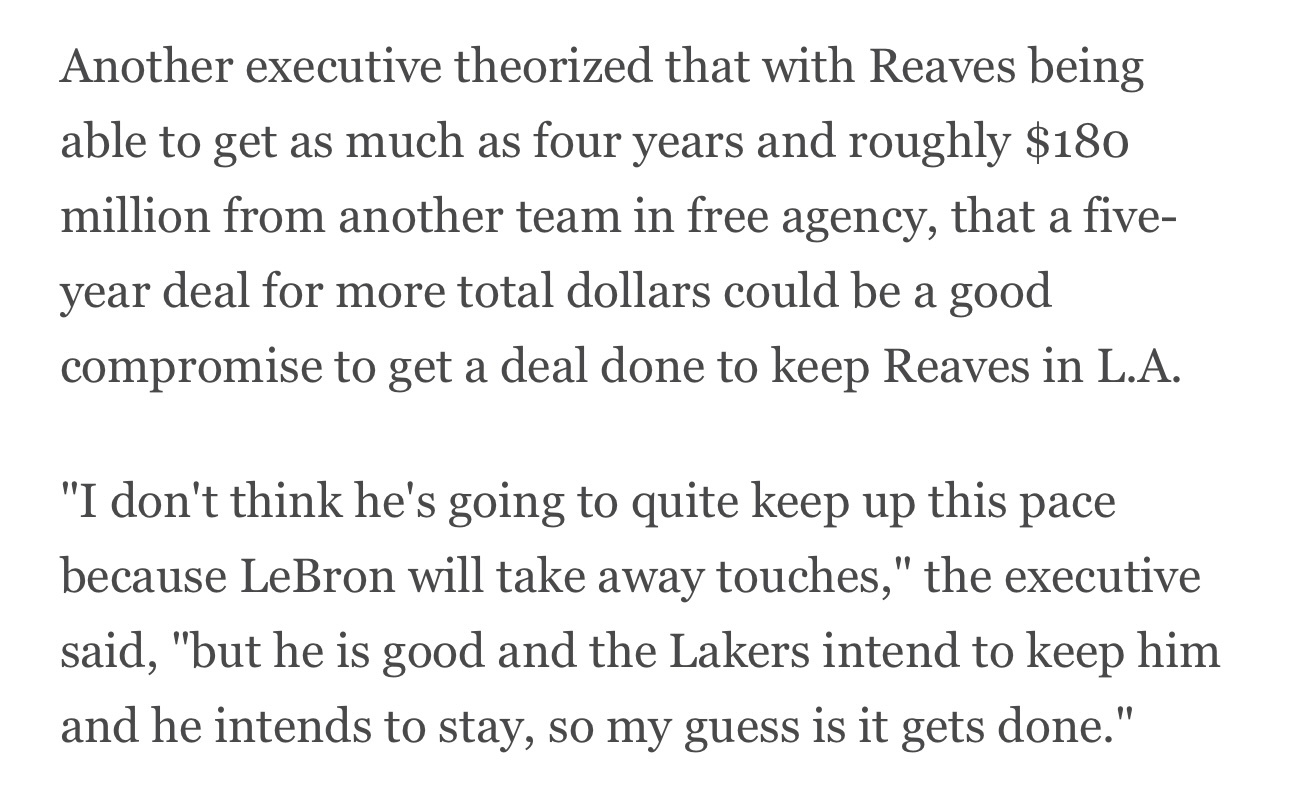 另一位高管推测,由于里夫斯明年在自由市场上能从其他球队获得一份大约4年1.8亿美元的合同,一份总额更高的5年合同可能是让他留在湖人的折中方案。