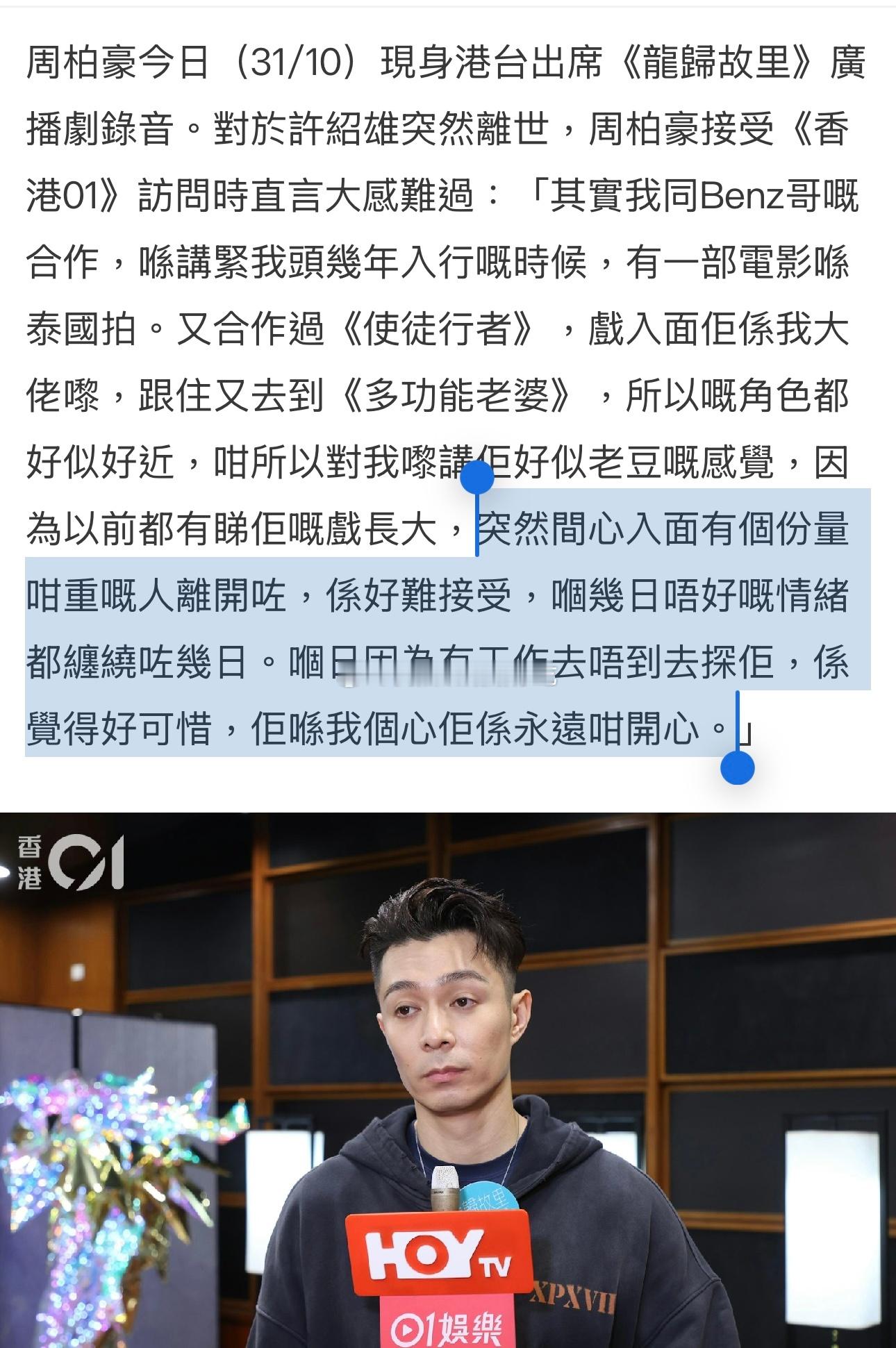 周柏豪谈许绍雄离世:「突然间心里面有个份量这么重的人离开了,是好难接受,那几日不好的情绪都缠绕了好几日。那天因为有工作去不了探望他,是觉得好可惜,他在我心里他是永远那么开心。」