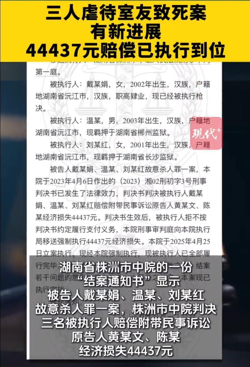 大家发现了吗? 这起骇人听闻的案件里最正确的事,就是法律终于让赔偿执行到位了。 四个00后同乡在长沙合租,本该互相帮衬,结果戴某某靠赌债成了“老大”,因为黄某送外卖出错,就带着另外两人用铁管打、开水烫、热油烫,折磨了近一个月,最后黄某惨死。主犯去年被判了死刑,可赔偿一直拖着没给。 法院发了结案通知书才知道,判决的44437元赔偿,被执行人一开始赖着不给,后来法院执行了才到位。三年前的惨案,总算在今天有了个收尾。 要是法律没坚持执行,受害者家属连这点补偿都拿不到,这能算公平吗?