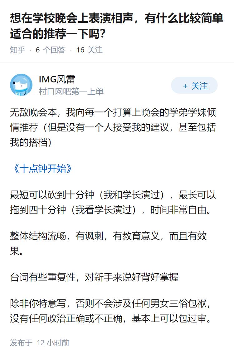 想在学校晚会上表演相声,有什么比较简单适合的推荐一下吗?