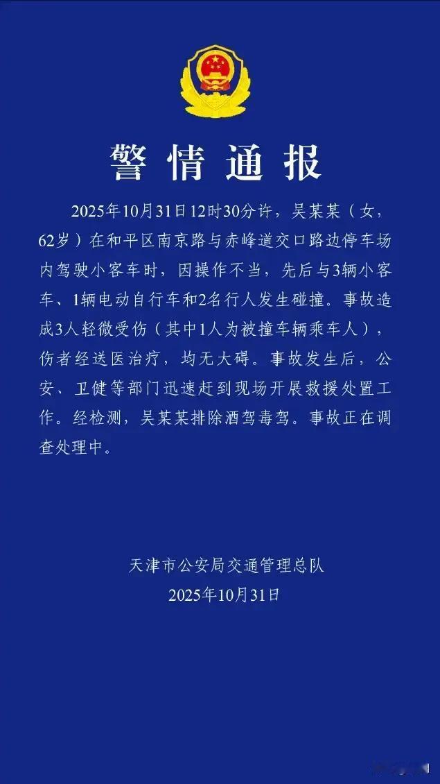 有些人真不适合开车,短短60秒,女子驾车前后两头撞击致多人受伤。事发10月31日中午12点30分,在天津和平大悦城停车场内,发生一起难以理解的交通事故。 通过监控发现,这辆小车先是突然加速倒车,撞倒后面的一辆汽车和电瓶车,还有一路人被撞。随后过了大概50秒,又突然加速向前,冲出停车场护栏,将非机动车道上骑车的电瓶车撞倒。 事故导致3人受伤,多车受损,经过调查,肇事小车司机吴某某,女,62岁,没有酒驾,初步判定为操作失误将油门当刹车踩,导致了这起事故,详细情况和后续处理还在进一步进行中。 天津和平大悦城发生交通事故3人受伤