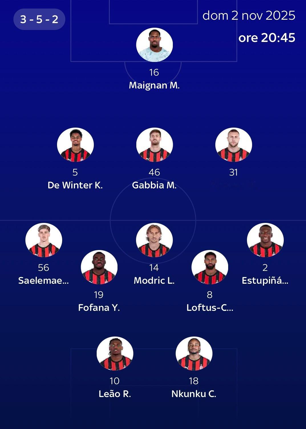 【Sky】该媒体给出的2025-26赛季意甲联赛 第十轮 -🔴⚫️米兰主场对阵罗马队「预计首发阵容」第①版本(352):