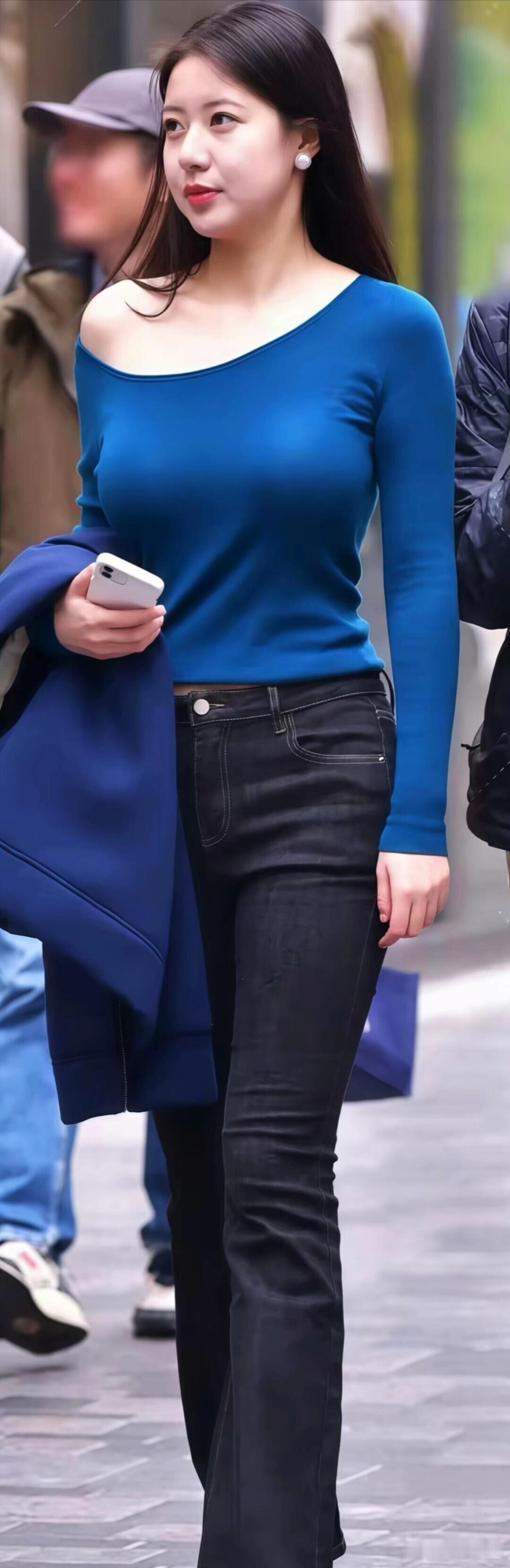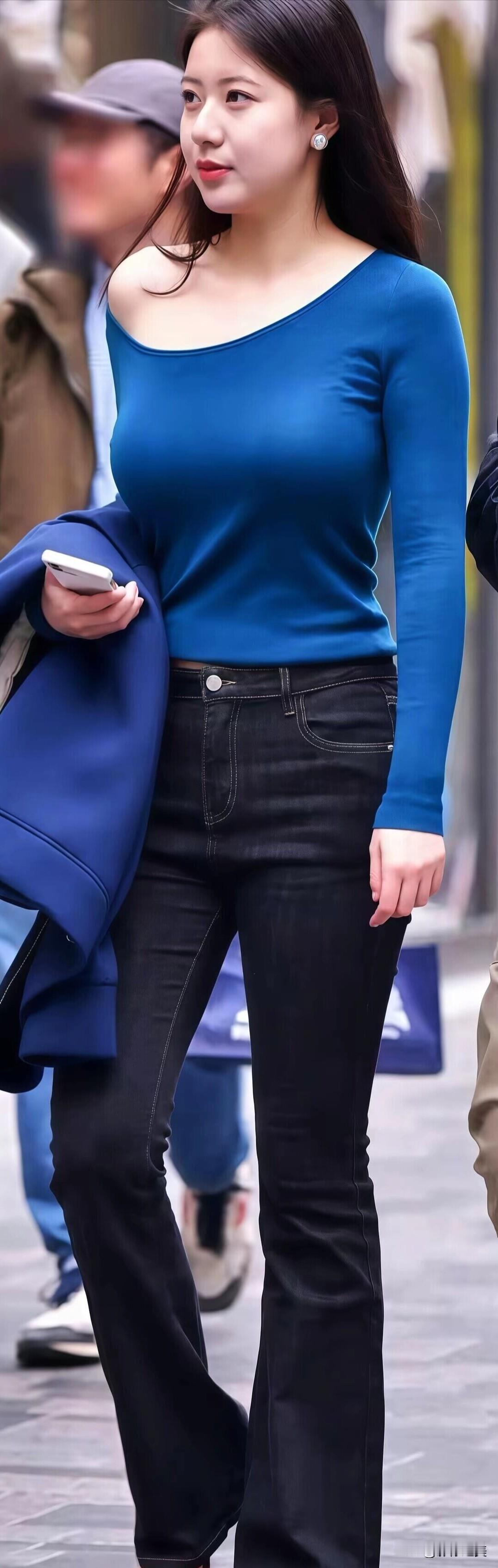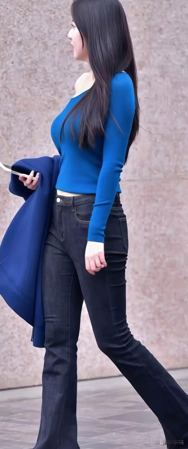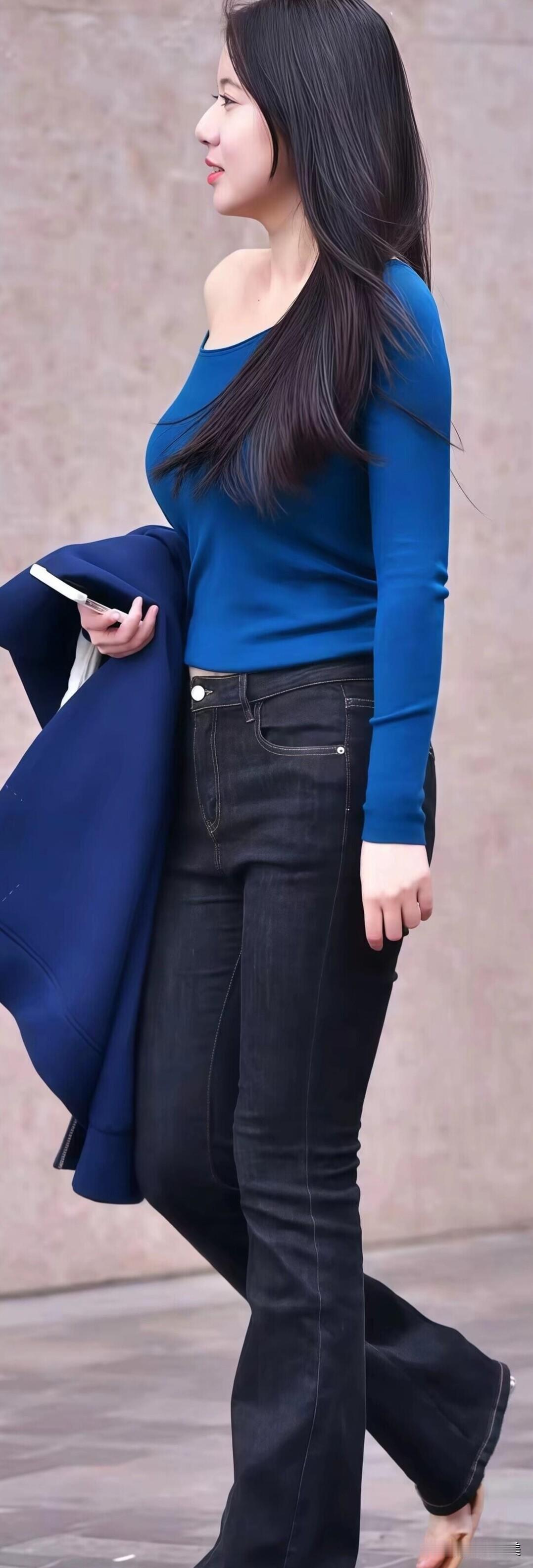宝蓝色露肩上衣,搭配黑色微喇裤,简约又高级,蓝色外套随手一搭,时尚感拉满,这穿搭太显气质了!