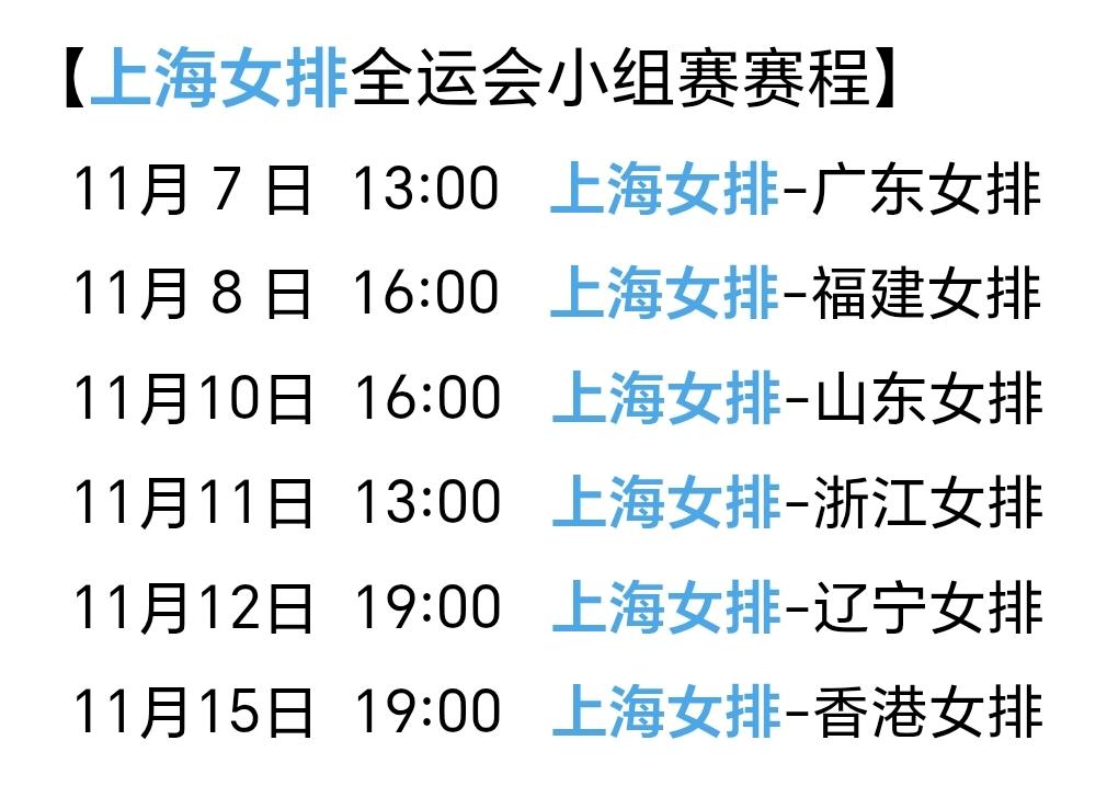 全运会|上海女排小组赛赛程 第十五届全运会上海女排小组赛赛程: 11月 7 日13:00上海-广东(陈佩妍,王逸凡) 11月 8 日16:00上海-福建(庄宇珊,郑益昕) 11月10日16:00上海-山东(王梦洁,杨涵玉) 11月11日13:00上海-浙江(倪梦杰) 11月12日19:00上海-辽宁(丁霞,胡铭媛) 11月15日19:00上海-香港 第十五届全运会上海女排十二人名单: 主攻:仲慧、刘哲宁、高卉宜 副攻:高意、薛翼枝、张钰倩、刘泽宇 接应:欧阳茜茜 二传:许晓婷、黄欣悦 自由人:王唯漪、朱星辰 上海女排在上届全运会中取得第四4️⃣,距离领奖台只差一步,本次全运会落入B组,将先后与广东、福建、山东、浙江、辽宁及香港女排展开较量。多年来,上海女排凭借完善的体系,在联赛中始终保持强劲竞争力,却屡屡与冠军失之交臂。这一次她们能否突破瓶颈,弥补四年前的遗憾?期待她们在全运赛场上破茧成蝶,终于登上那渴望已久的领奖台!🏐