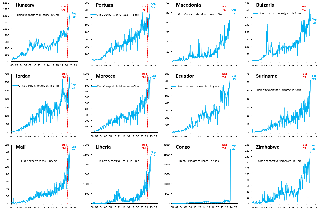 “中国对各个地方的出口正在飙升,因为以前流向美国的商品现在正在寻求新的市场。这种贸易转移是出口部门深陷困境的迹象,美国应该利用这一点。”