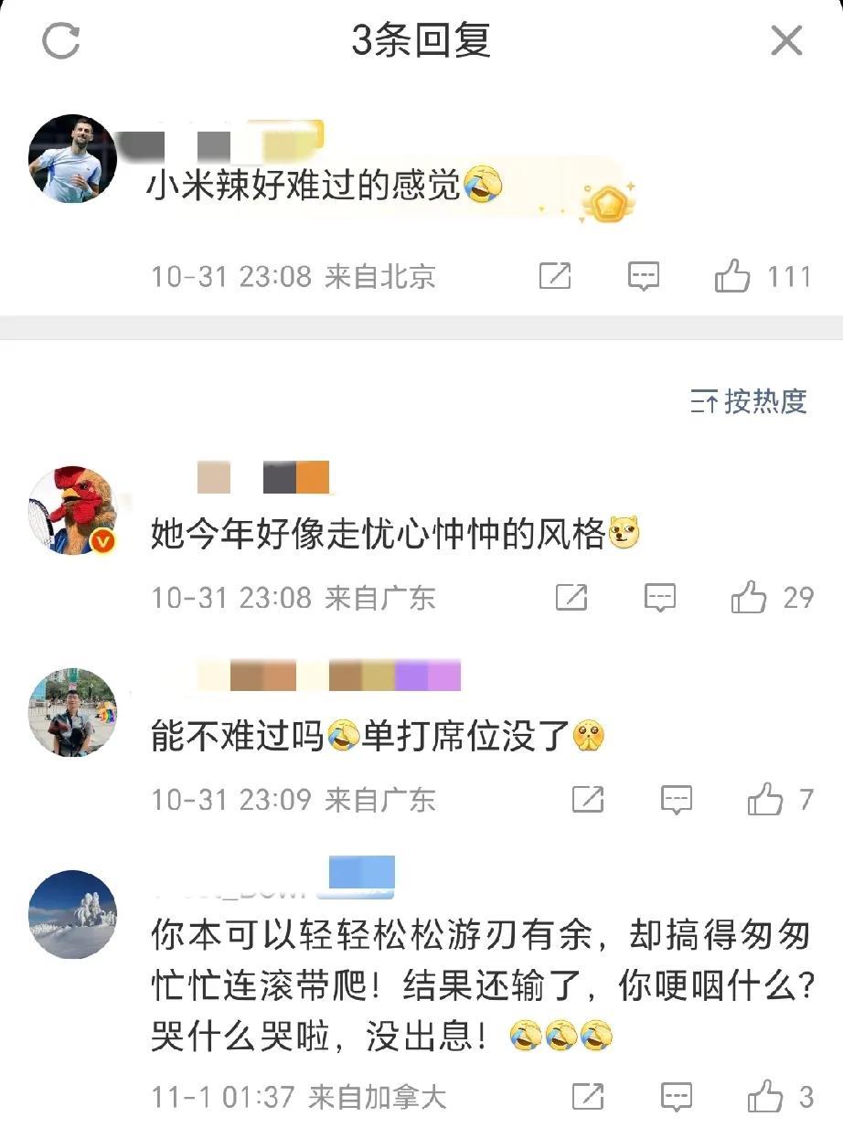 小米拉年终的妆造,真是一言难尽。 明明才18岁,非要打扮得这么成熟。再加上忧心忡忡的表情,没有了往日青春可爱的模样。 是因为得罪了造型师,还是因为单打席位没了而难过? 有网友甚至调侃: 本来可以轻轻松松游刃有余,却搞得匆匆忙忙连滚带爬!结果还输了,你哽咽什么?哭什么哭啦,没出息! 不管大家怎么说,才18岁的小米拉今年赛季确实成绩亮眼、进步神速,不愧是“天才少女”。 未来还有很多机会,希望她总结经验教训,重拾信心,继续加油吧! #新锐创作者成长计划#