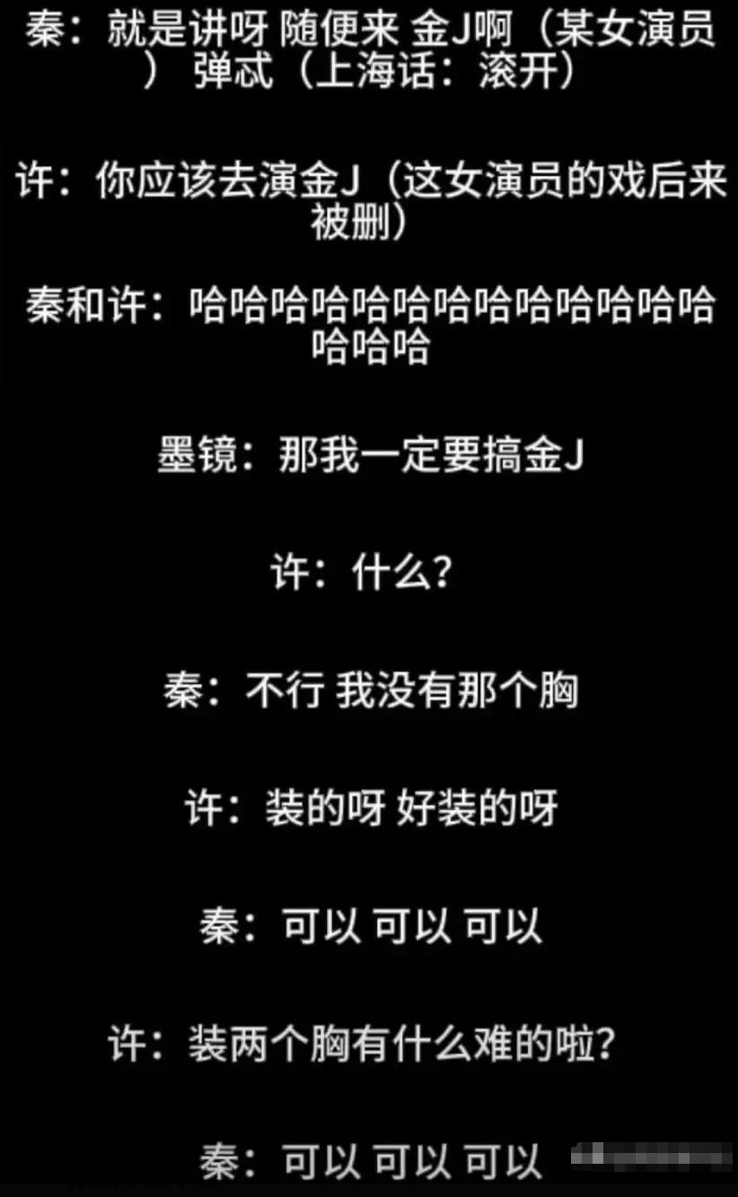 王家卫没有对金靖开黄腔,那段音频我认真听完了,如果没理解错,就是这个许编剧说秦雯编剧可以去演金靖这个角色,然后老王就说你演的话我肯定要搞你;然后小秦说自己胸没金那么大,许说胸可以装的;后面老王就说你要是胸有这么大就当不上编剧,我早把你收了。