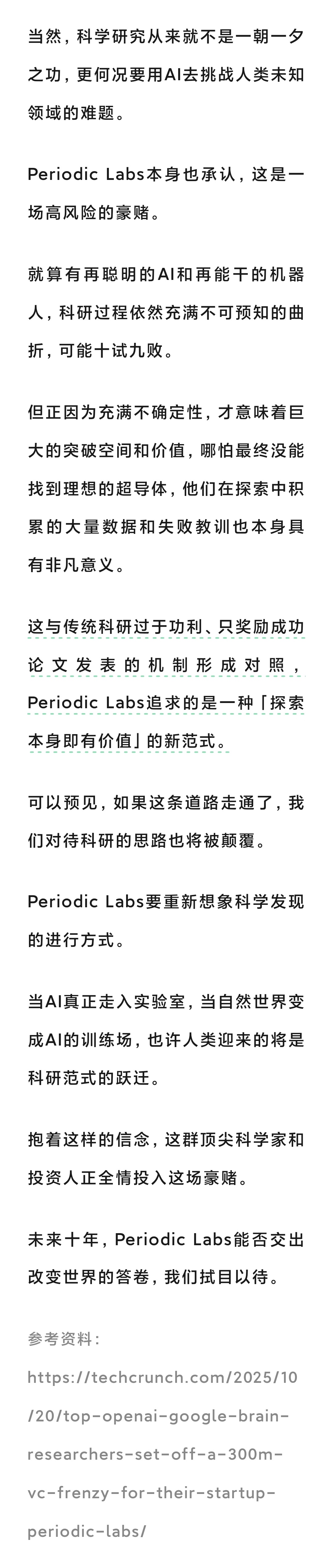文中的创业大神就说:AI的主要目标根本不是替白领自动化办公。AI的主要目标,是加速科学。光靠大模型在文本中推理几天几夜,不可能凭空蹦出惊世骇俗的科学发现。真正的科学突破离不开大量实验和无数次失败的淬炼。
