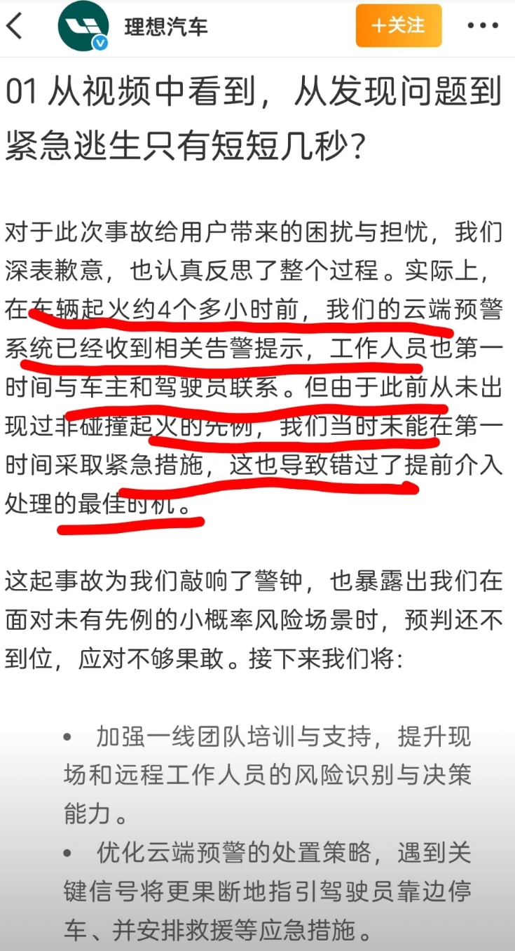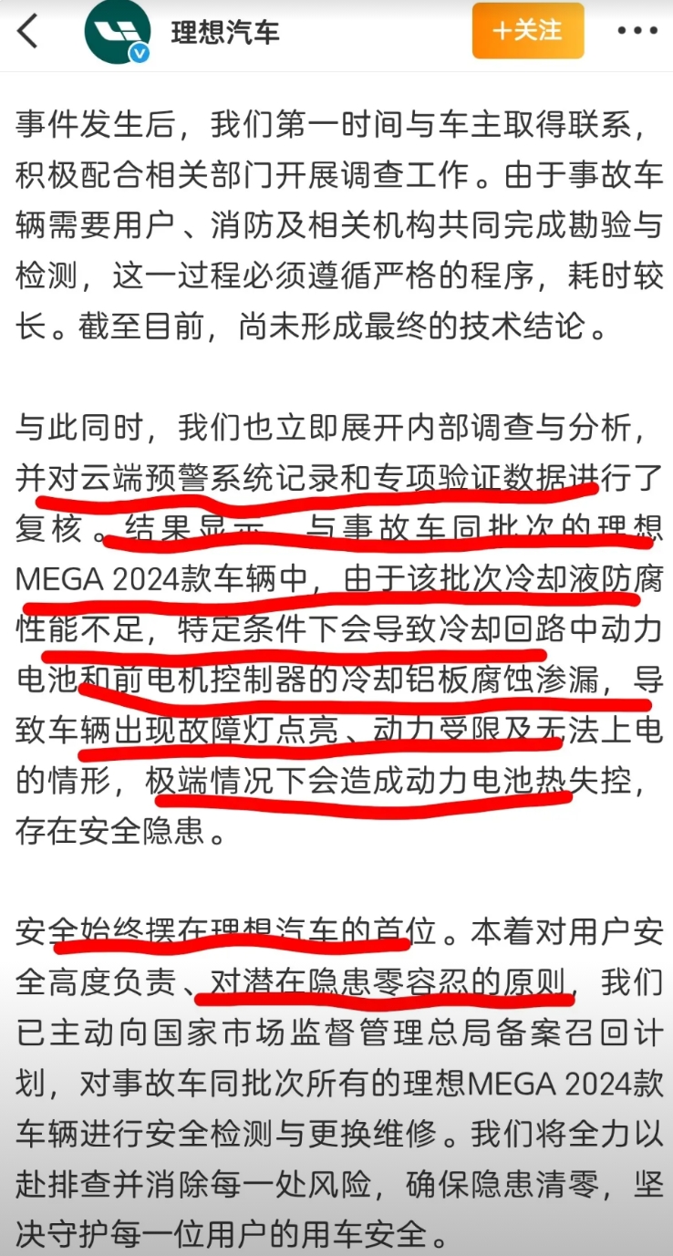 又是主动召回,又是万分之一风险不能等,是真的没等还是一直在等?你们的官方通报可是透露得清清楚楚! 看图二,上海理想Mega起火后,在尚未得出事故结论的情况下,理想通过云端预警记录和专项验证数据,确认事故车同一批次所有车辆冷却液防腐性能不足,会造成电池电控冷却液泄露,极端情况下会出现热失控(自燃)! 再看图三,车辆起火前4小时,预警系统已经有告警,但由于此前从未产生过非碰撞起火先例,所以他们没有第一时间采取紧急措施。 这两段描述说明了什么问题?那就是理想早就知道这批车冷却液有问题!但是因为没有产生过自燃,所以他们一直存在侥幸心理,只要换掉有问题的冷却液就没事了,反正没自燃过,出问题也不是啥大问题。 但是上海这辆Mega捅破了这层窗户纸,车辆正常行驶中起火,这事就很大了!然而事发第一时间理想内部人员和理想御用KOC竟然造谣车主电池磕碰过,官方联系车主维修车主没有理会等等,气得受害车主直接发律师函!随后不止车主等理想的回应,所有Mega车主都在等理想一个交待,更恶劣的影响是差点毁了三元锂电池行业。 这回纸包不住火了,理想开始有担当了,开始主动召回了,开始安全第一位了,开始零容忍了,脸呢?
