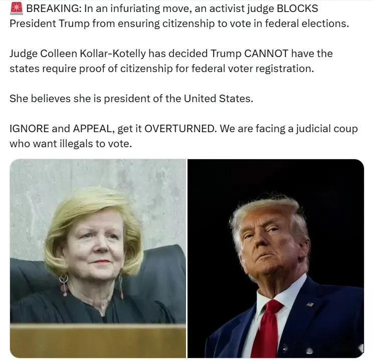 一名左派激进法官阻止了特朗普总统确保联邦选举中只有公民才能投票的举措。 法官科琳·科特利裁定,特朗普不能要求各州在联邦选民登记时必须提供公民身份证明。 她似乎认为自己才是美国总统。 美国正面临一场“司法正变”,这些人想让非法移民也能投票。