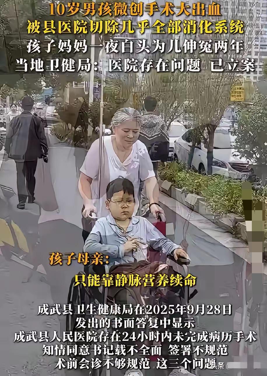 10岁娃被切光消化系统!“手术依赖症”才是最该治的病! 10岁孩子的肚子里,器官几乎被切空?就因为一场微创手术大出血,消化系统没了,只能靠静脉营养液活命,妈妈熬得一夜白头,维权两年才等来卫健委“医院有问题”的立案回应。 这事看得人脊背发凉,更戳心的是“手术依赖”早已成通病。世界卫生组织说理想剖宫产率该在10%-15%,可我国都飙到43%以上,不少医院为利润把手术当首选,忘了“能保守不手术”的底线。 手术本是救命的最后手段,如今却成了某些医院的“常规操作”。家长的信任、患者的健康,不能成了随意开刀的代价。卫健局的立案只是开始,根治“过度医疗”才是真的给百姓安全感。 你身边遇到过“被建议手术”的情况吗?该怎么拦住这些没必要的刀?来评论区聊聊!