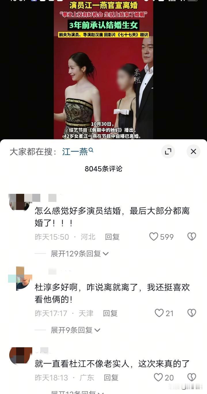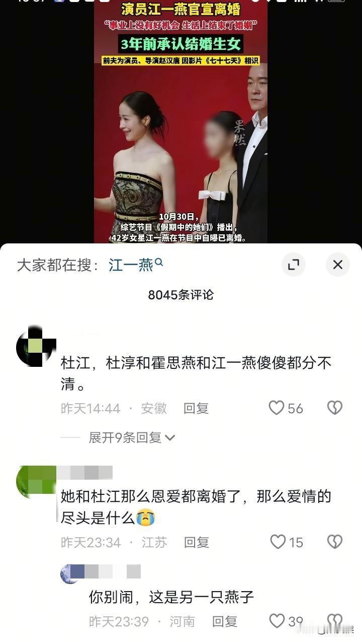 江一燕官宣离婚,没想到杜淳跟着挨了骂。 原来网友们不止江一燕、霍思燕傻傻分不清楚,而且就连霍思燕的老公杜江和杜淳的名字也搞混了。 10月31日,江一燕在参加节目时说出自己已经离婚的消息。可没想到很多网友在评论区骂起了杜淳,罪名是他始乱终弃,这可真是躺着也中枪呀。 要说杜淳也是挺怨的,他和江一燕没啥关系,完全是八杆子打不着。江一燕这次离婚的老公叫赵汉唐,而且杜淳也不在江一燕众多前男友的名单里。 原来是网友们把江一燕和霍思燕搞混了,因为她俩名字里都带燕字,而且长相也差不多,又都是同时代流量小花。 霍思燕的老公叫杜江,和杜淳只差了一个字。江一燕、霍思燕傻傻分不清楚,杜江、杜淳也分不清楚,最后江一燕离婚,杜淳挨骂。 这个乌龙背后的原因还是因为这些演员不是很红,没有更多的经典形象就在观众心里,他们在网友的脑海里也只是一个名字,没有立体的形象。 做为演员想出名还是靠打磨演技,在影视剧中树立经典的形象,留给观众一个深刻的印象,而不是靠离婚、分手这样绯闻来博取眼球获得流量。 大家怎么看江一燕离婚这件事呢?