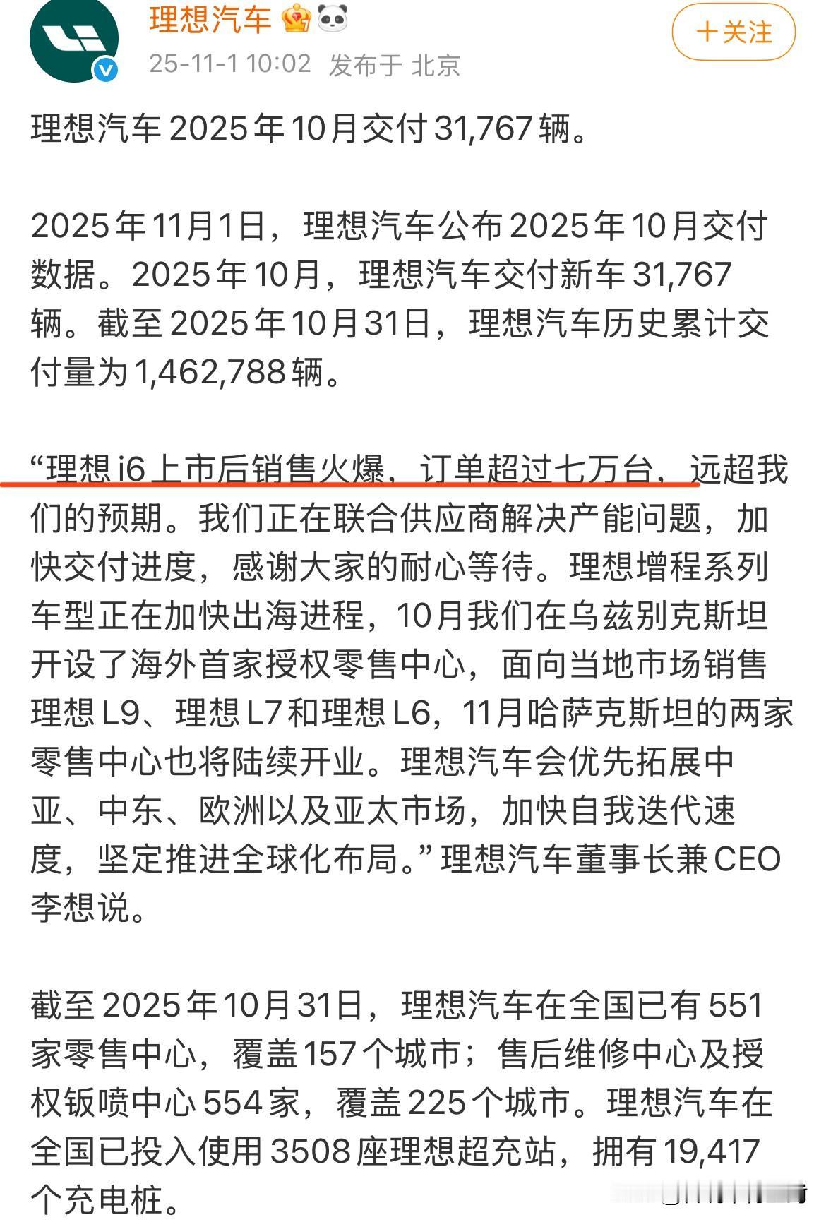 理想汽车10月交付31767辆。 相比9月份的33951辆,略有下滑。 不过,理想也罕见的公布了i6的订单表现,上市后订单超过7万台(图二),但是,应该是受制于产能的原因,i6的火爆还不能完全填补L系列下滑后的空缺…… 看明年L系列改款的情况了,增程的基本盘理想还是必须要稳住的。