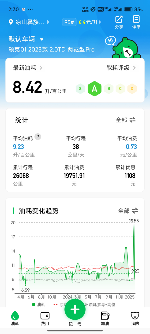 加快两万块的油了 高速油耗基本都在7-8个,鄙人开车比激情,不允许前面有车,哈哈哈哈哈哈哈 市区郊区油耗较高,以前动不动都是19.9L/100km现在可能更新了都15.9L/100km 综合下来百公里需9个多油,约73元 一箱油高速约在6-700公里,市区约在4-500公里,欢迎大家探讨