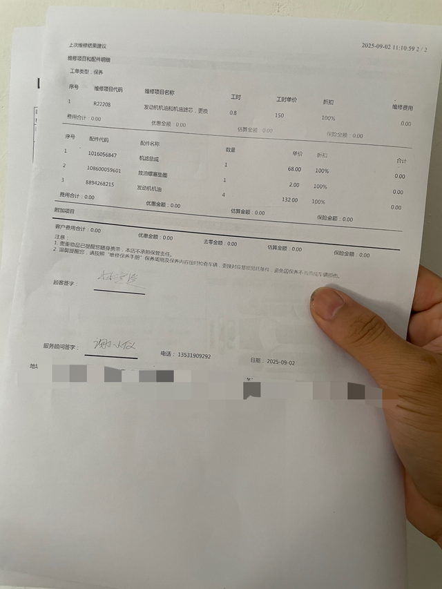 领克08保养真那么离谱吗? 总有人说领克的保养贵得离谱?真是那么一回事吗?今天给我的领克08做二保,看看都有哪些项目,有哪些内容。 ✒️车型:2023款领克08 120Halo 坐标:广东揭阳 保养次数:二保 ✏️领克08的保养时间分为两种,一种是1w5公里,一种是365天,以先到为准就可以保养了!驱车半小时到店里,今天工作日车子并不多,即便我没有预约也可以直接到排队,售后小哥说预计2个小时,在检查完外观确定项目签名就可以开始了,售后小哥先是插上电脑排查,然后就是打开机舱吹尘、放机油、换机油、换机滤和密封圈,还进行了轮胎、天窗、刹车油、冷却液等等这些检查,由于车间太热了,我就没有看完全程,去了休息区休息,也有电视可以查看保养的进度,这点还是不错的,随后吃了在店里中午饭之后售后告知保养已好,我是十点来的,十二点多就告诉我好了,时间为两个小时,还是蛮快的。 最后是费用结算,本次二保共计更换机油*4、机滤*1、密封圈*1,机油费用为4*132=528元,机滤68元,垫圈2元,工时150元,共计748元,这次保养我没有更换空调滤芯,如果加上空调滤芯就是100元,共计848元,每年发一次抵扣券300元,也就是一年一个常规小保是548元,我个人觉得这个费用还是可以的在我的接受范围之内,最后大家觉得这个保养费用怎么样?