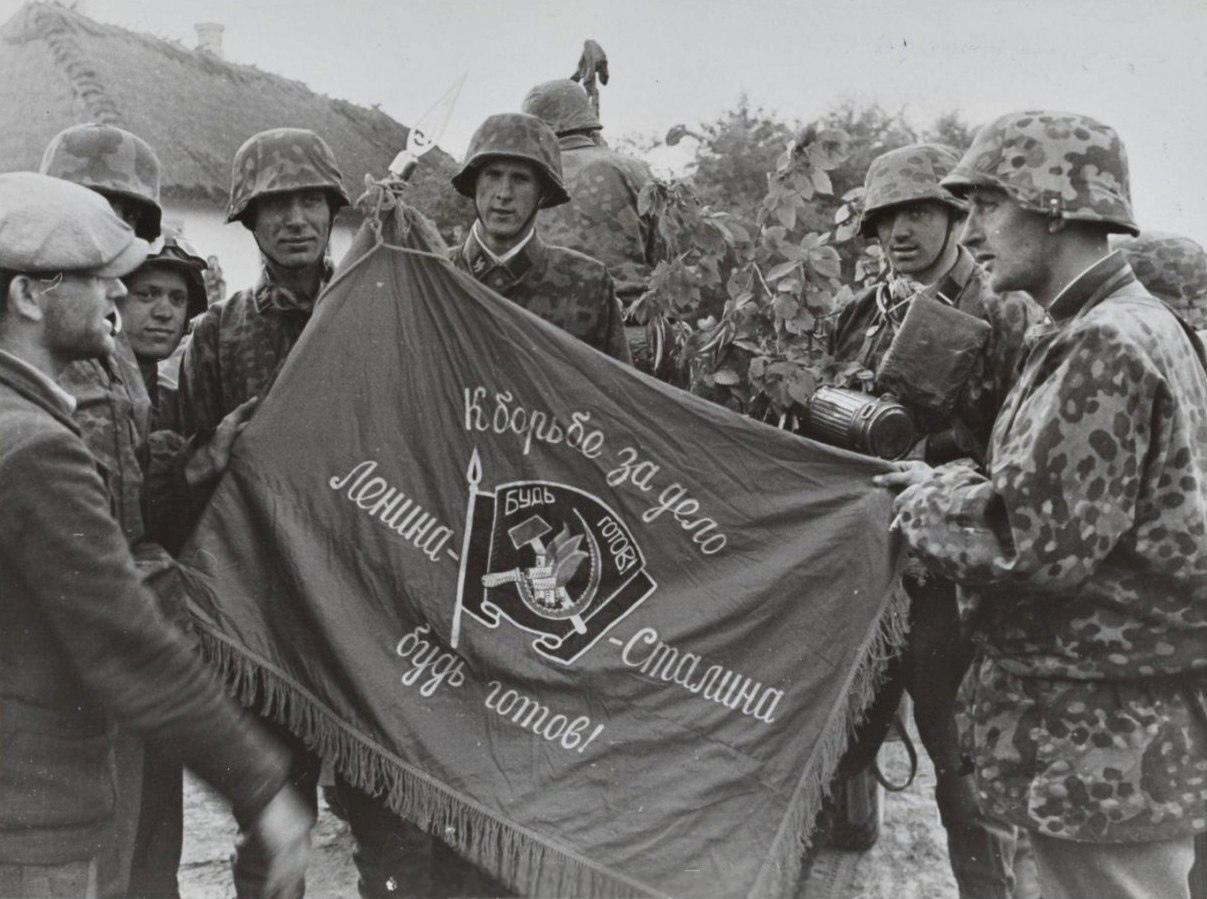 [呲牙] 德国人这是吃了没文化的亏?还是揣着明白装糊涂——1941年,苏联某地,德军部队攻克当地之后,把当地少先队室荣誉陈列室的流动奖旗当作苏军军旗,不但公开展示,还让随军记者大拍特拍。 上世纪30年代,苏联各级单位、企业和部队都时常开展竞赛活动,红色流动奖旗作为荣誉标志在各地之间流转。这类旗帜外观庄重,通常陈列在列宁室或者少先队室,但本质上仅是纪念品,与代表部队番号、遗失即导致部队解散的“战斗军旗”有本质区别。 当时苏军规定,战况危急时必须护送战斗军旗转移,而对于各类“纪念旗” “表彰旗”则无严格规定。对不熟悉苏联制度的德军而言,每面红色旗帜都被视作重要战利品,不仅专门撰写缴获报告,还据此判定已歼灭相应苏军单位。当时,德军在基辅、明斯克等地缴获的上千面“纪念旗”被归档为重要战利品,而同期苏军实际遗失的战斗军旗仅17面。