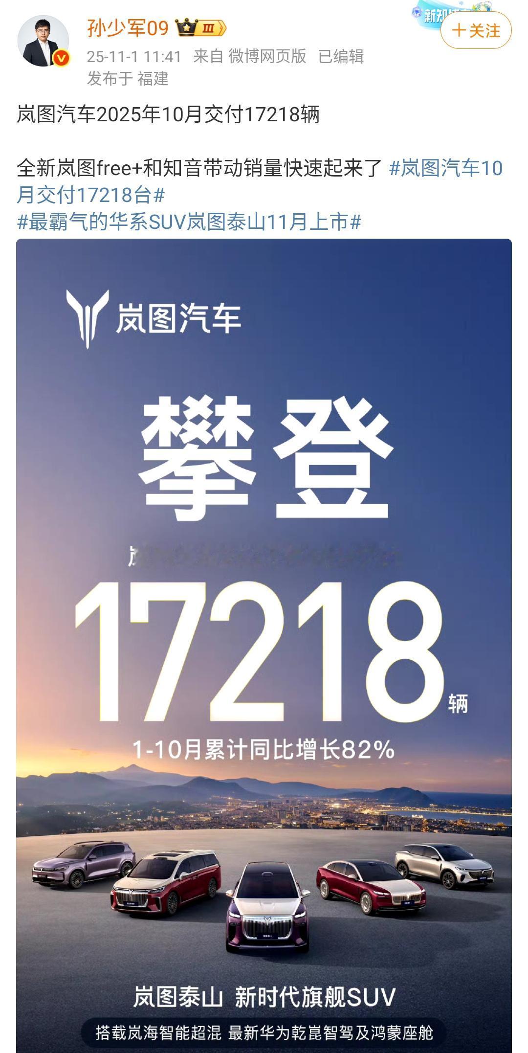 孙少军:岚图汽车10月份交付17,218台! 这个成绩对这个品牌来说应该是非常不