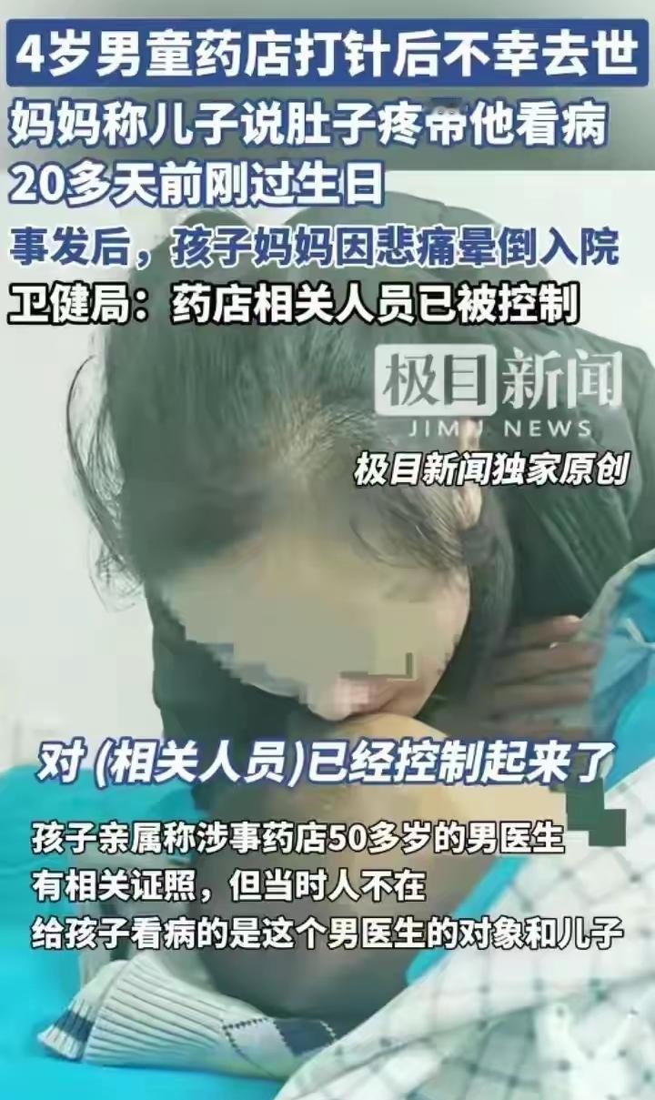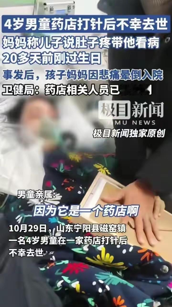心疼!4岁娃打一针没了,妈妈哭晕倒,涉事人已被抓,官方已介入 山东宁阳县,一个刚满4岁的男童,生命永远定格在了10月29日。 那天下午,因为肚子疼,妈妈带他去了家附近的药店。店里的藏某某没问过敏史,没做皮试,甚至连处方单都没开,直接就给孩子打了针。 可悲剧就在走出药店后发生了。孩子开始剧烈呕吐,随后嘴唇发紫、全身抽搐。尽管妈妈拼尽全力送医抢救,但短短两个小时,这个小生命还是没能留住。悲痛欲绝的妈妈当场哭晕过去,住进了医院。 更让人心寒的是,这家药店本就没有行医资质,给孩子打针的藏某某也不是执业医师。店里那个有证的医生当时根本不在场。这完全是一起因非法行医、漠视生命安全酿成的人间惨剧。 目前,涉事人员已被警方控制,官方也已介入调查。但无论后续如何处理,一个家庭的破碎已经无法挽回。