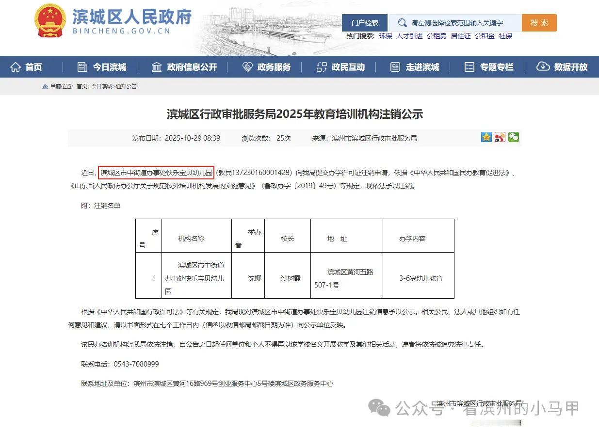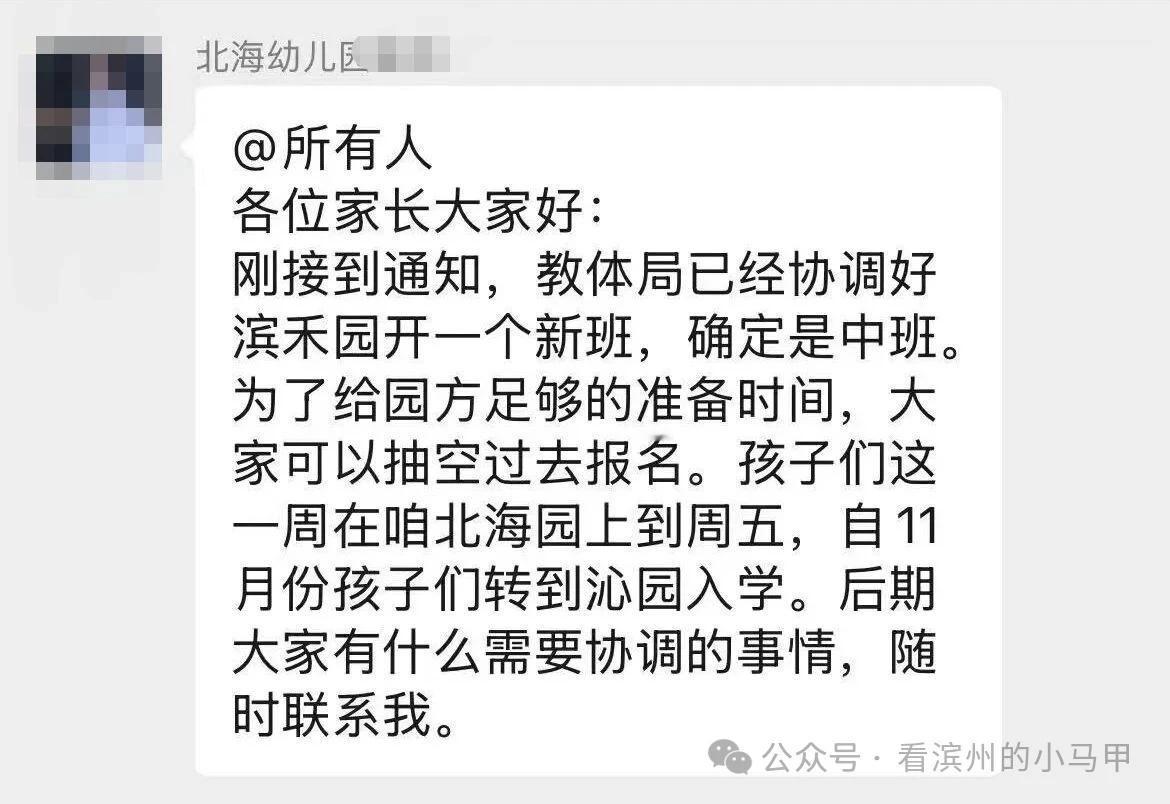 滨州一知名幼儿园即将停办! 10月29日,山东滨州滨城区人民政府官网公布一则公示:信息显示,位于滨州市滨城区黄河五路507-1号的“滨城区市中街道办事处快乐宝贝幼儿园”依法予以注销。(图一) 事实上,近两年一些民办幼儿园面临生源大幅减少、房租居高不下等因素,陆续出现幼儿园关停潮。 另: 前几天,小编还收到位于渤海十五路张课家园沿街的“北海幼儿园”家长投稿,因适龄幼儿数量大幅减少,幼儿园不得不选择停办,而在此上学的孩子需要进行分流。终于,在滨城区教体局的协调之下,在附近的一棉幼儿园滨禾园开一新班接收......(图二图三)
