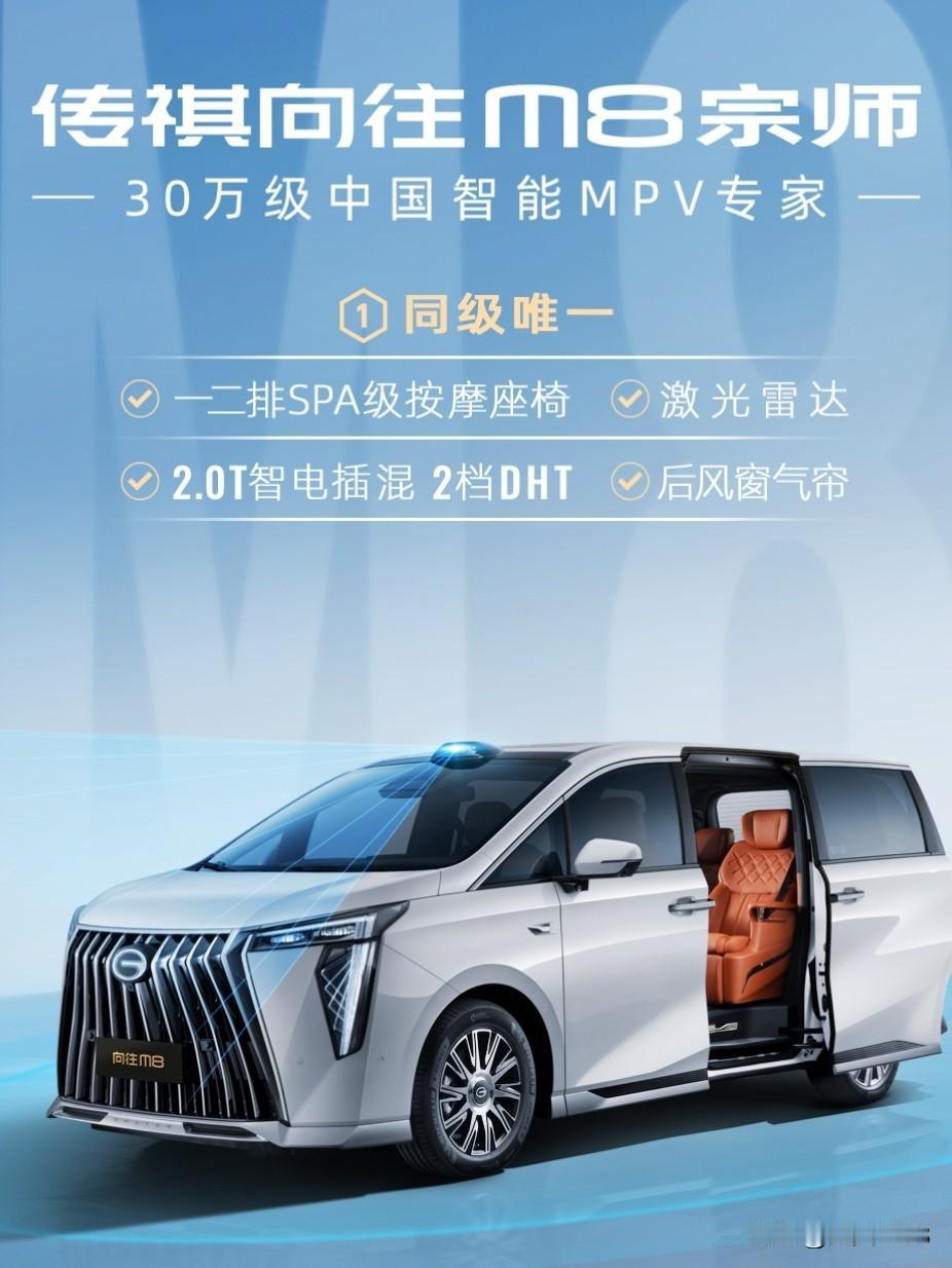 传祺向往M8宗师它是10月16日正式发布的插混中大型MPV,上市指导价为26.9