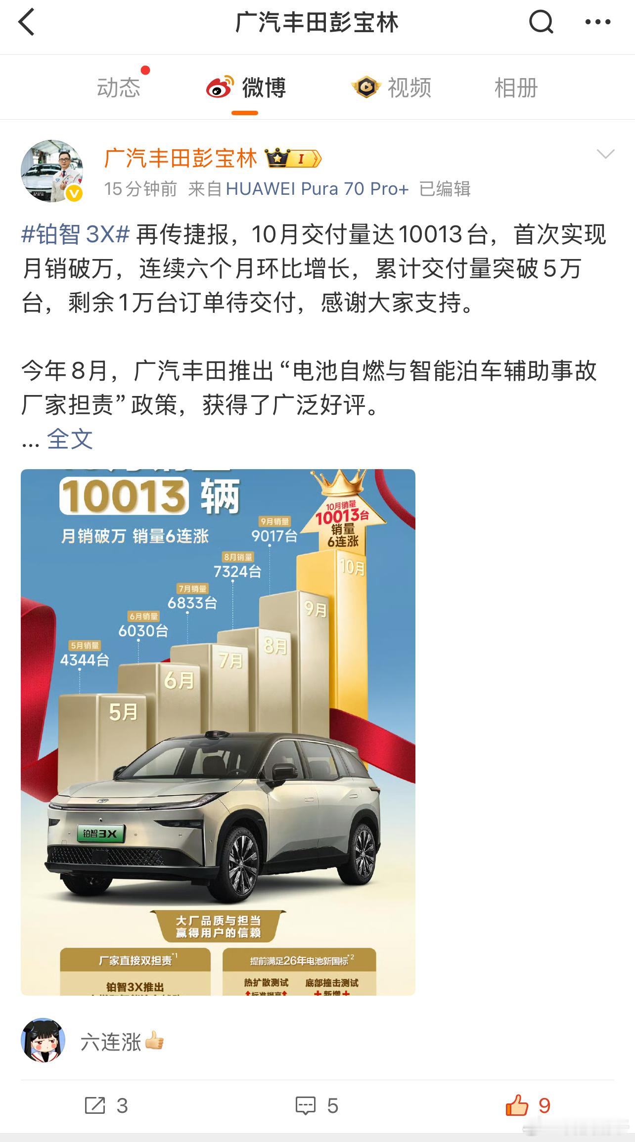 铂智3X月销量破万 广汽丰田铂智3X上个月销量突破了1W+,其实10月销量答卷,足以印证“用户思维+大厂担当”才是智电时代的破局密钥。10013台的交付量,不仅是其首次月销破万,更是连续六个月环比增长的“六连涨”底气,累计5万台的交付量与1万台待交付订单,直接坐实了市场对它的认可。