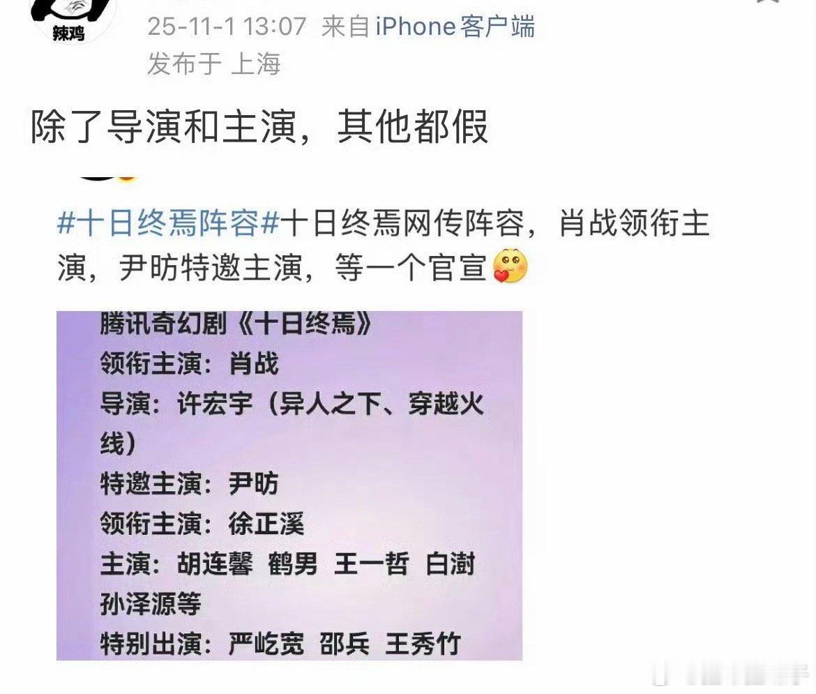 十日终焉阵容虽然但是,打个假,除了定下来的男主和导演,其他阵容都不对,网传男主挑不了刺就编造虚假配角阵容,妄图激发书粉逆反,等正式官宣的时候那不得大破防 十日终焉影视化 十日终焉