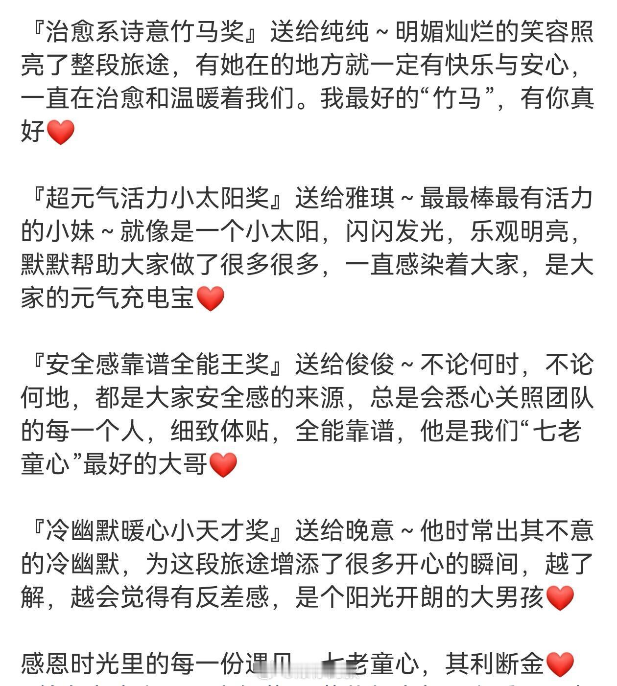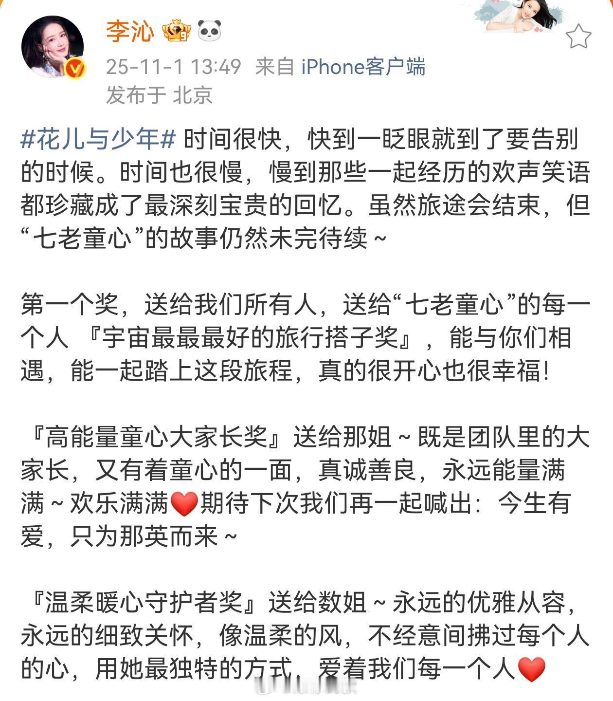 李沁发文告别花少,给“七老童心”每一个人颁奖。李沁眼中的七老童心,高能量童心大家长奖那英,温柔暖心守护者奖陈数,治愈系诗意竹马奖马思纯,超元气活力小太阳奖张雅琪,安全感靠谱全能王奖龚俊,冷幽默暖心小天才奖张晚意~