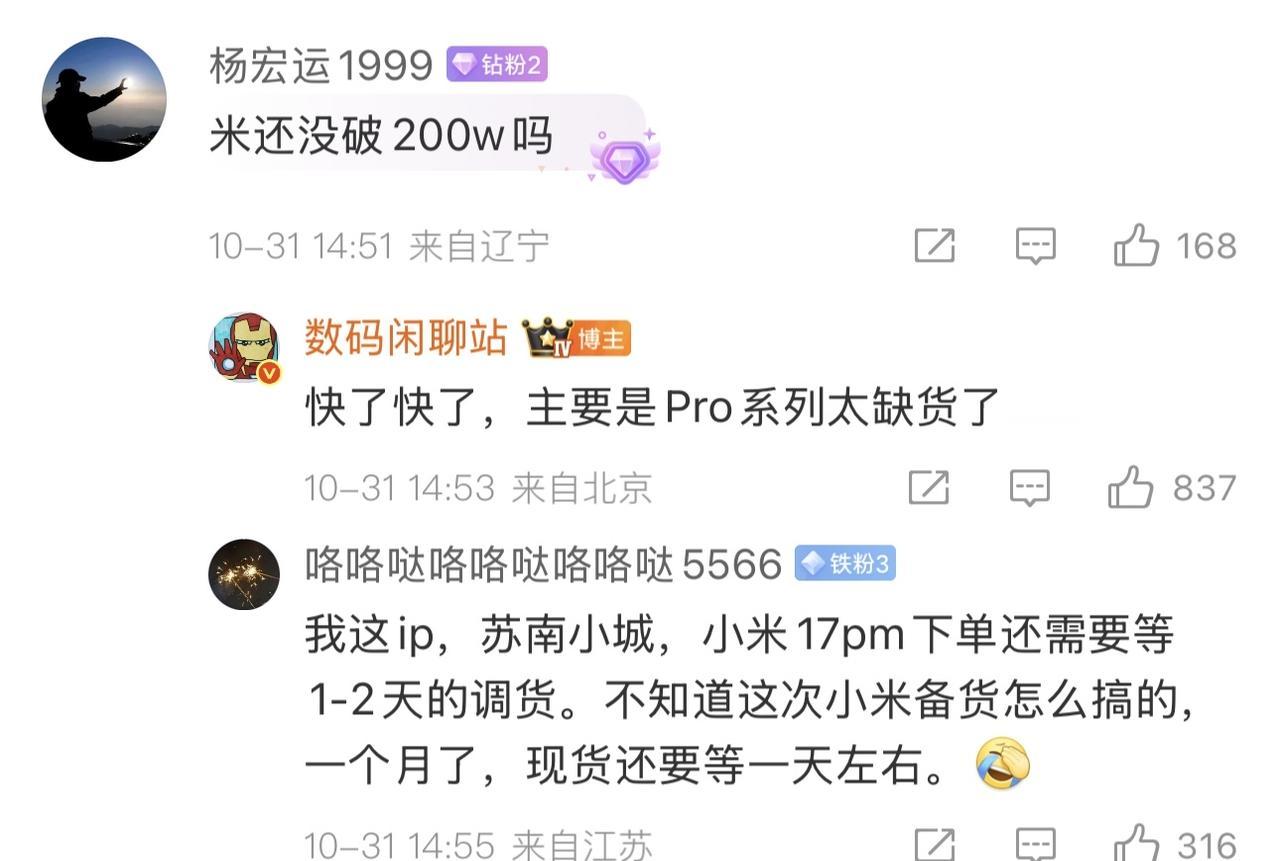 骂得越狠,卖的越多! 销量出来才知道谁在裸泳 闲聊站公布国产机销量,大家对号入座: 截止W43/10.26累积激活销量, 小米17系列——185.2W±/开售29天 vivo x300系列——39.0W±/开售9天 Oppo Find x9系列——25.8W±/开售4天 荣耀Magic 8系列——10.4W±/开售3天 怎么说呢,今年小米17系列的确算是狠活产品了,一个背屏把好多人路转粉了,再加上骁龙8Elite Gen5比较好的能效,最起码发热方面没翻车,一下快破200万了,而闲聊站也说了,没破是因为缺货...国产机唯二能跟苹果掰手腕的[狗头] 当然了,小米17Pro Max本身也在线,用了这么久,我是觉得体验不差: 🎮:骁龙8E5性能绰绰有余,玩原铁基本不咋掉帧,功耗也不高,打王者也不像米14那样容易热,大机身散热不错。有人反馈发热,可能是刚买,机子还在学习中,小米是有这个过程的。 🔋:7500mAh的大电池没想象那么耐用,但比之前小米14和iPhone16 Pro耐用了太多。并且用7天后,续航会稳定变好,也是米机子软件学习你用机习惯的过程。 📷:确实没有Ultra那种影像的惊艳感,但作为Pro中杯,也还是不错的,徕卡光影感很不错,加上逆光算法的优化,短板很小了 📱:屏幕提升较大,虽然还是1.5K屏,但是RGB技术确实牛,看起来跟2K屏没区别,但肉眼观感比小米14和iPhone16 Pro都好,另外频闪也比iPhone好太多。 总的来说不错,HyperOS 3不拖后腿了,对比iOS26来说是真流畅,对的苹果今年iOS26拉了坨大的,小米销量高可能也有果子一份力[笑哭]。